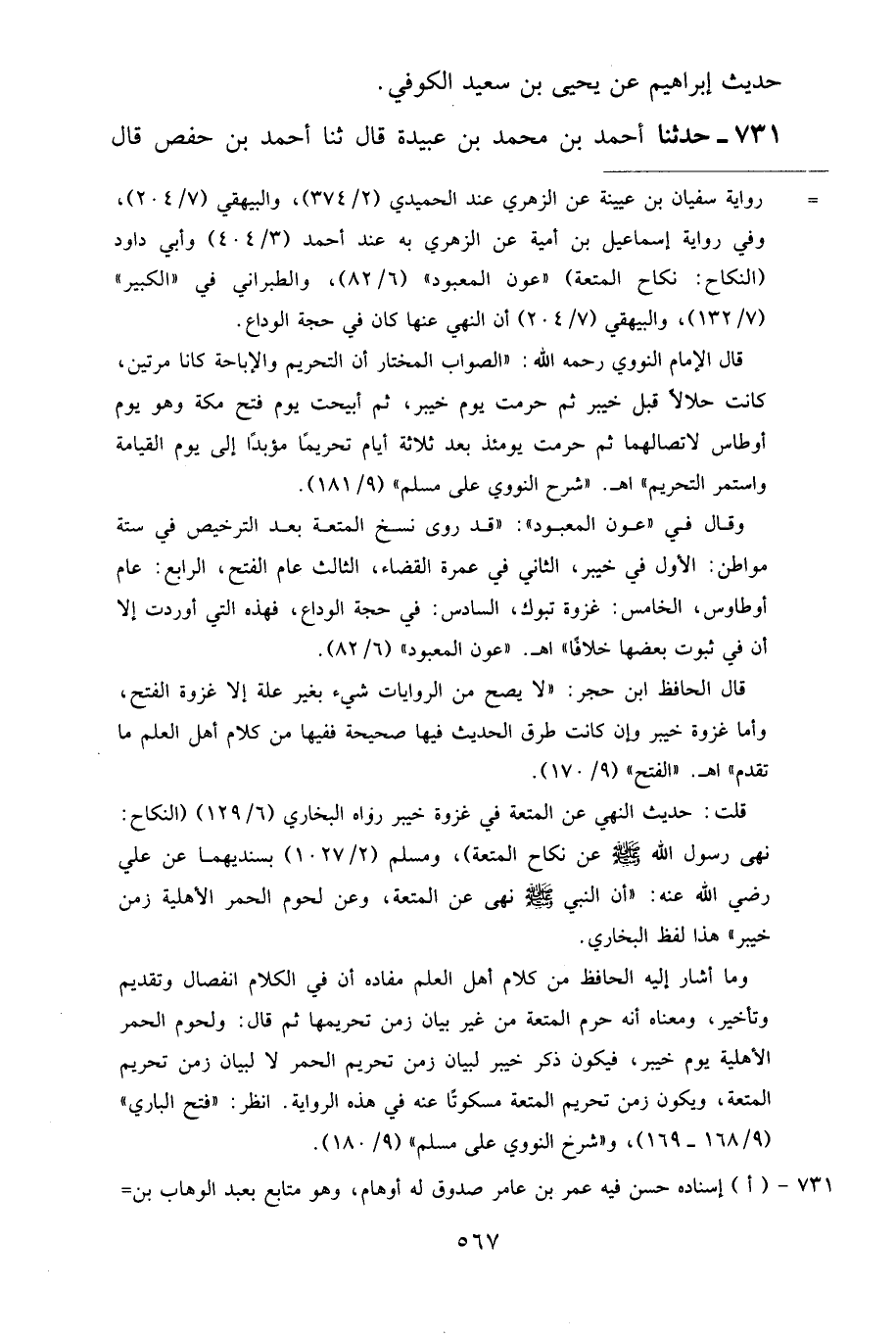 731 - حَدَّثَنَا أَحْمَدُ بْنُ مُحَمَّدِ بْنِ عُبَيْدَةَ قَالَ: ثنا أَحْمَدُ بْنُ حَفْصٍ قَالَ -[568]-: حَدَّثَنِي أَبِي، حَدَّثَنَا إِبْرَاهِيمُ، عَنْ يَحْيَى بْنِ سَعِيدٍ الْكُوفِيِّ، عَنْ عُمَرَ بْنِ عَامِرٍ، وَعَبْدِ الْوَهَّابِ، عَنْ أَنَسِ بْنِ مَالِكٍ، أَنَّهُ قَالَ: نَهَى رَسُولُ اللَّهِ صَلَّى اللهُ عَلَيْهِ وَسَلَّمَ عَنْ أَكْلِ لُحُومِ الْأَضَاحِيِّ فَوْقَ ثَلَاثَةِ أَيَّامٍ، وَعَنِ النَّبِيذِ فِي الْحَنْتَمِ، وَالدُّبَّاءِ، وَالنَّقِيرِ، وَالْمُزَفَّتِ، وَعَنْ زِيَارَةِ الْقُبُورِ، قَالَ: ثُمَّ قَالَ: «أَمَا إِنِّي كُنْتُ نَهَيْتُكُمْ عَنْ ثَلَاثٍ، ثُمَّ بَدَا لِي بَعْدُ أَنِّي كُنْتُ نَهَيْتُكُمْ عَنْ أَكْلِ لُحُومِ الْأَضَاحِيِّ فَوْقَ ثَلَاثَةِ أَيَّامٍ» وَذَكَرَ الْحَدِيثَ