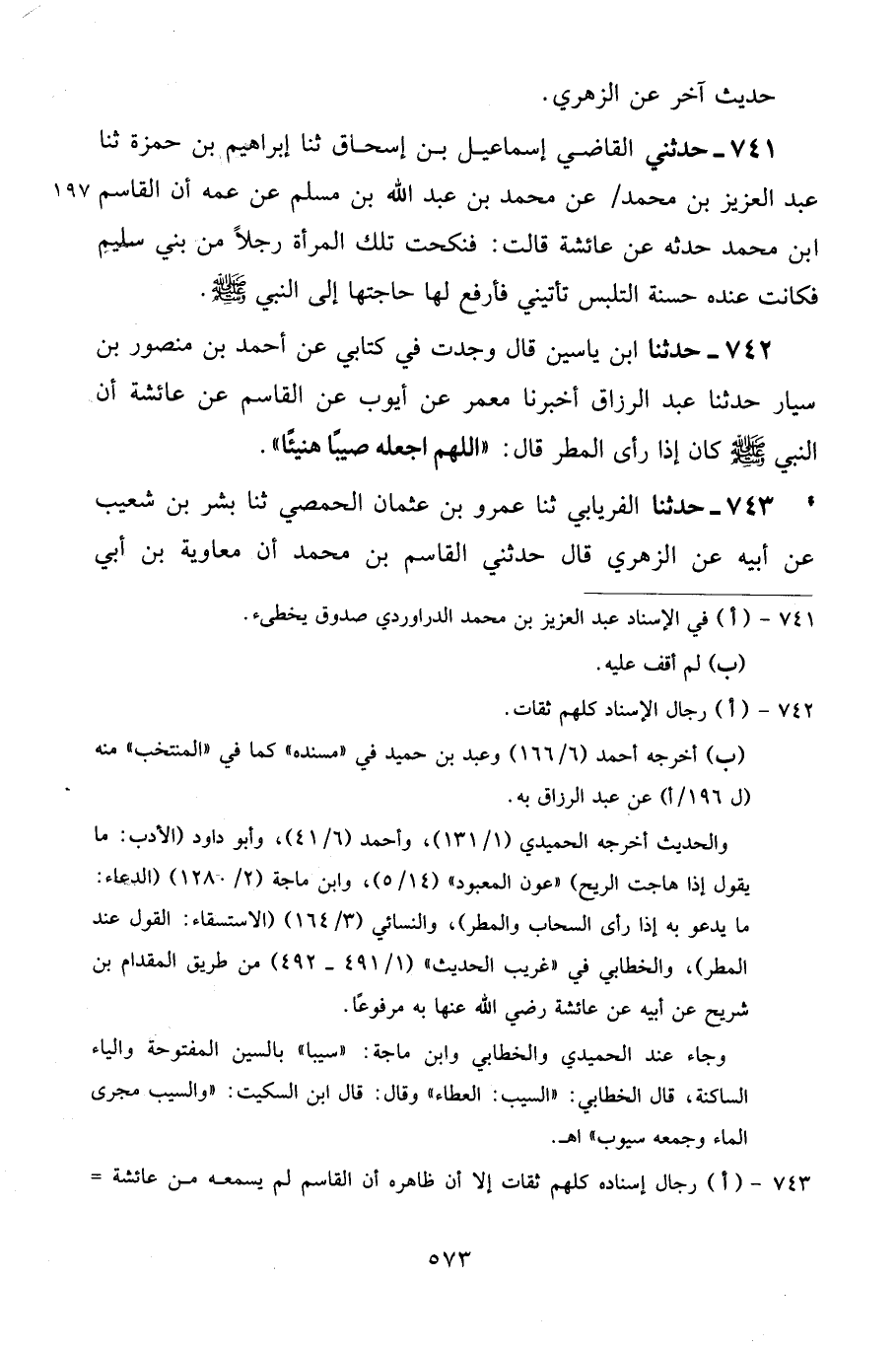 742 - حَدَّثَنَا ابْنُ يَاسِينَ قَالَ وَجَدْتُ فِي كِتَابِي، عَنْ أَحْمَدَ بْنِ مَنْصُورِ بْنِ سَيَّارٍ، حَدَّثَنَا عَبْدُ الرَّزَّاقِ، أَخْبَرَنَا مَعْمَرٌ، عَنْ أَيُّوبَ، عَنِ الْقَاسِمِ، عَنْ عَائِشَةَ، أَنَّ النَّبِيَّ صَلَّى اللهُ عَلَيْهِ وَسَلَّمَ كَانَ إِذَا رَأَى الْمَطَرَ قَالَ: «اللَّهُمَّ اجْعَلْهُ صَيِّبًا هَنِيئًا»
