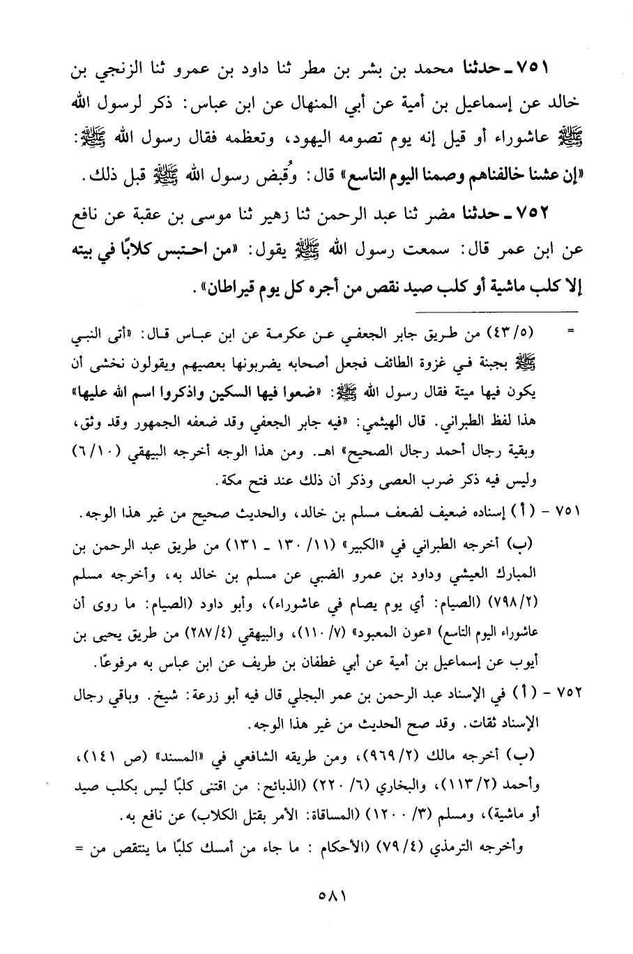 751 - حَدَّثَنَا مُحَمَّدُ بْنُ بِشْرِ بْنِ مَطَرٍ، ثنا دَاوُدُ بْنُ عَمْرٍو، ثنا الزَّنْجِيُّ بْنُ خَالِدٍ، عَنْ إِسْمَاعِيلَ بْنِ أُمَيَّةَ، عَنْ أَبِي الْمِنْهَالِ، عَنِ ابْنِ عَبَّاسٍ ذُكِرَ لِرَسُولِ اللَّهِ صَلَّى اللهُ عَلَيْهِ وَسَلَّمَ عَاشُورَاءَ أَوْ قِيلَ: إِنَّهُ يَوْمٌ تَصُومُهُ الْيَهُودُ، وَتُعَظِّمُهُ، فَقَالَ رَسُولُ اللَّهِ صَلَّى اللهُ عَلَيْهِ وَسَلَّمَ: «إِنْ عِشْنَا خَالَفْنَاهُمْ وَصُمْنَا الْيَوْمَ التَّاسِعَ» قَالَ: وَقُبِضَ رَسُولُ اللَّهِ صَلَّى اللهُ عَلَيْهِ وَسَلَّمَ قَبْلَ ذَلِكَ