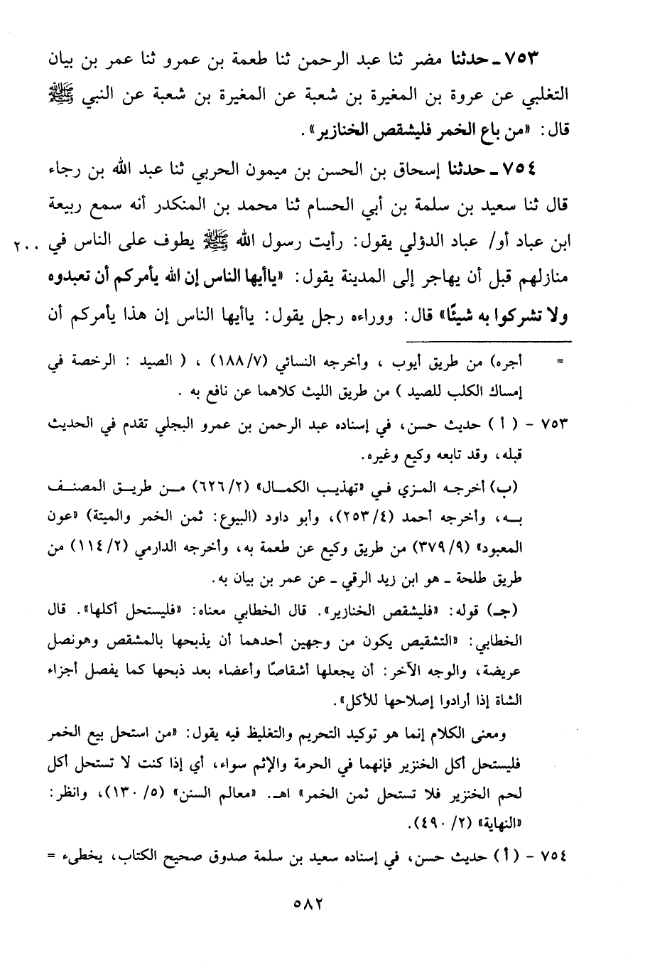 753 - حَدَّثَنَا مُضَرُ، ثنا عَبْدُ الرَّحْمَنِ، ثنا طُعْمَةُ بْنُ عَمْرٍو، ثنا عُمَرُ بْنُ بَيَانٍ التَّغْلِبِيُّ، عَنْ عُرْوَةَ بْنِ الْمُغِيرَةِ بْنِ شُعْبَةَ، عَنِ الْمُغِيرَةِ بْنِ شُعْبَةَ، عَنِ النَّبِيِّ صَلَّى اللهُ عَلَيْهِ وَسَلَّمَ قَالَ: «مَنْ بَاعَ الْخَمْرَ فَلْيُشَقِّصِ الْخَنَازِيرَ»