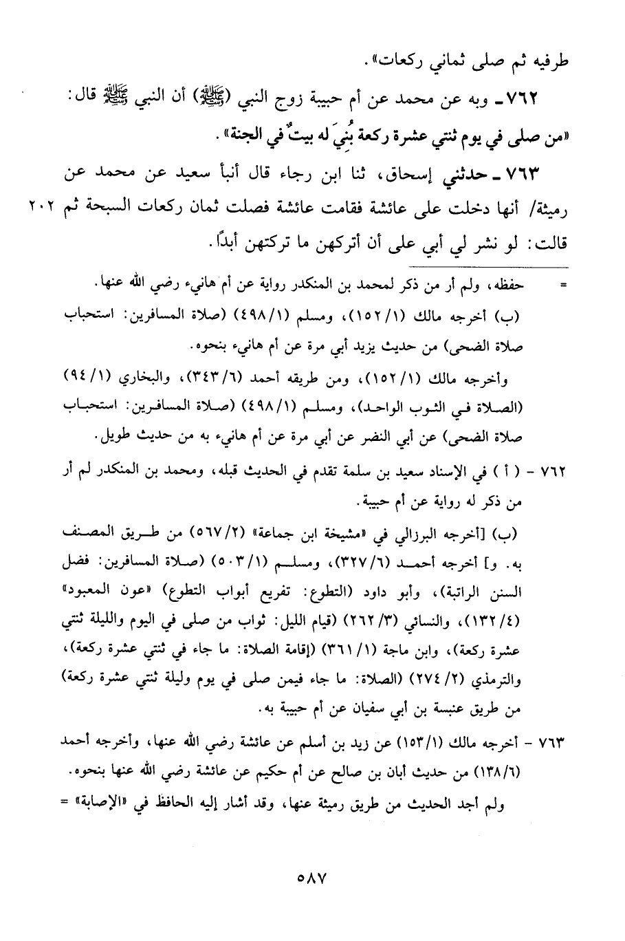 762 - وَبِهِ عَنْ مُحَمَّدٍ، عَنْ أُمِّ حَبِيبَةَ، زَوْجِ النَّبِيِّ صَلَّى اللهُ عَلَيْهِ وَسَلَّمَ أَنَّ النَّبِيَّ صَلَّى اللهُ عَلَيْهِ وَسَلَّمَ قَالَ: «مَنْ صَلَّى فِي يَوْمٍ ثِنْتَيْ عَشْرَةَ رَكْعَةً بُنِيَ لَهُ بَيْتٌ فِي الْجَنَّةِ»