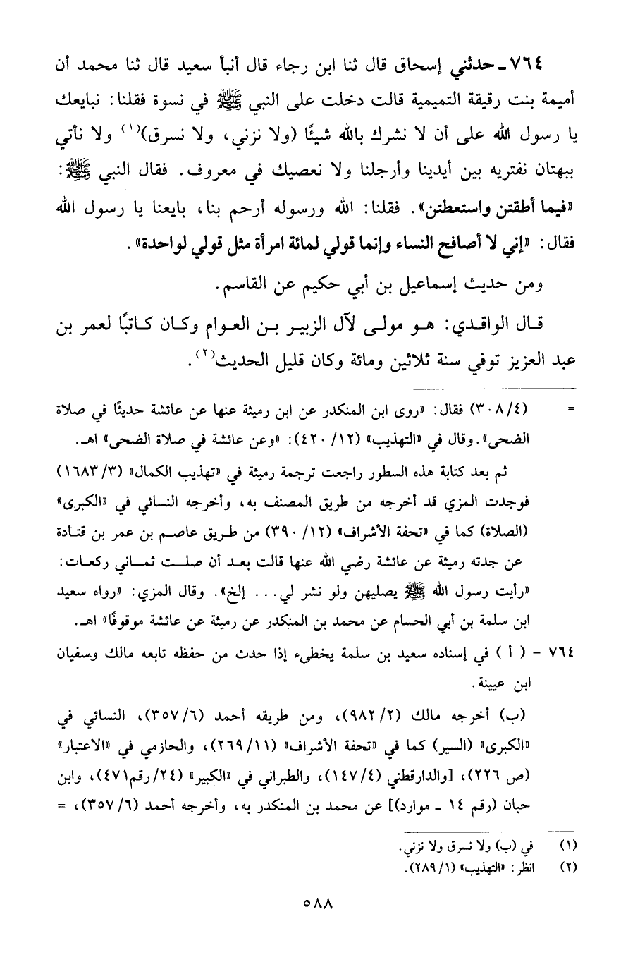764 - حَدَّثَنِي إِسْحَاقُ قَالَ: ثنا ابْنُ رَجَاءٍ قَالَ: أَنْبَأَ سَعِيدٌ قَالَ: ثنا مُحَمَّدٌ، أَنَّ أُمَيْمَةَ بِنْتَ رُقَيْقَةَ التَّمِيمِيَّةَ، قَالَتْ: دَخَلْتُ عَلَى النَّبِيِّ صَلَّى اللهُ عَلَيْهِ وَسَلَّمَ فِي نِسْوَةٍ فَقُلْنَا: نُبَايِعُكَ يَا رَسُولَ اللَّهِ عَلَى أَنْ لَا نُشْرِكَ بِاللَّهِ شَيْئًا وَلَا نَزْنِيَ، وَلَا نَسْرِقَ وَلَا نَأْتِيَ بِبُهْتَانٍ نَفْتَرِيهِ بَيْنَ أَيْدِينَا وَأَرْجُلِنَا وَلَا نَعْصِيَكَ فِي مَعْرُوفٍ، فَقَالَ النَّبِيُّ صَلَّى اللهُ عَلَيْهِ وَسَلَّمَ: «فِيمَا أَطَقْتُنَّ وَاسْتَطَعْتُنَّ»، فَقُلْنَا: اللَّهُ وَرَسُولُهُ أَرْحَمُ بِنَا، بَايِعْنَا يَا رَسُولَ اللَّهِ فَقَالَ: «إِنِّي لَا أُصَافِحُ النِّسَاءَ وَإِنَّمَا قَوْلِي لِمِائَةِ امْرَأَةٍ مِثْلُ قَوْلِي لِوَاحِدَةٍ»
