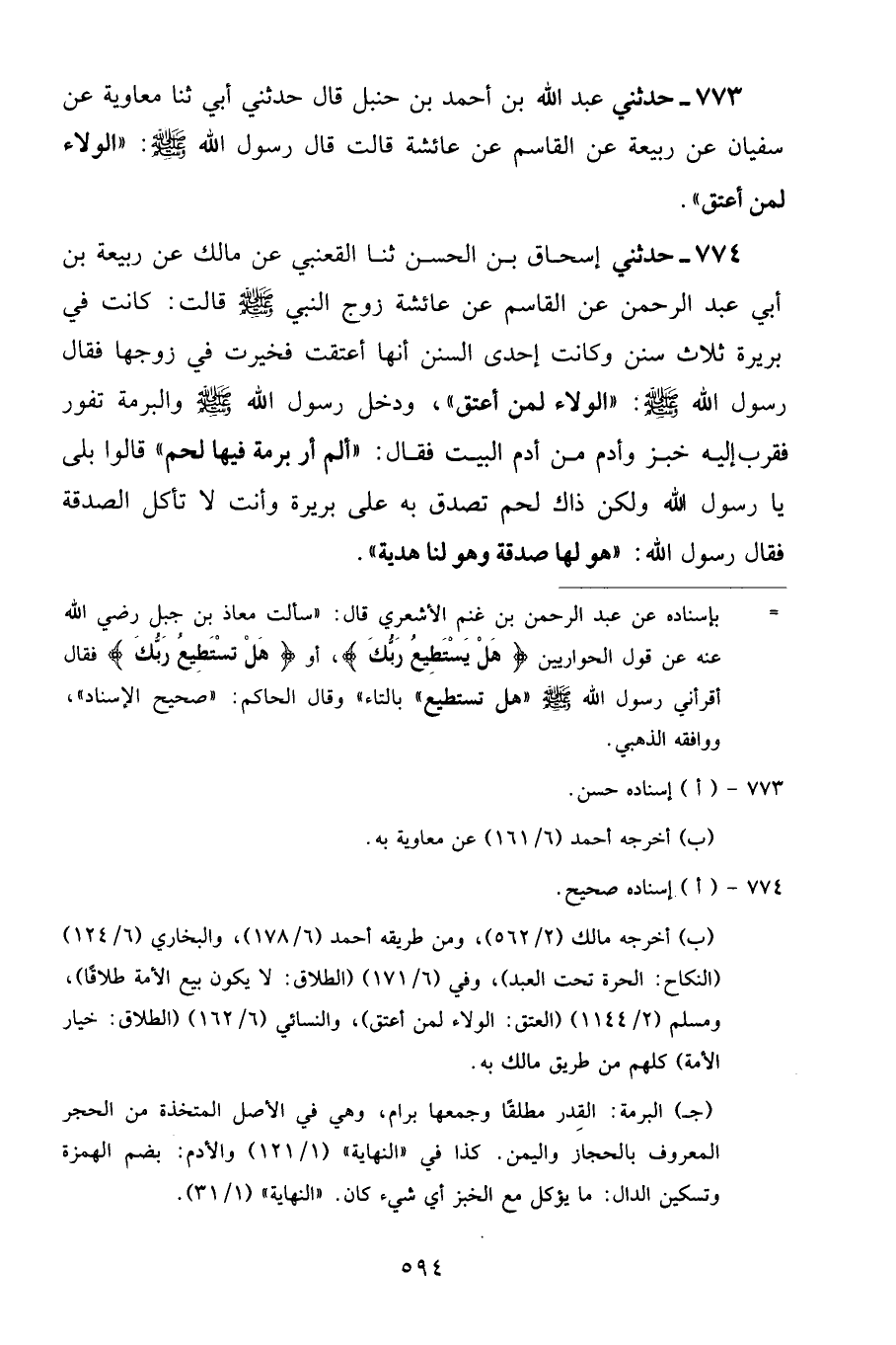 773 - حَدَّثَنِي عَبْدُ اللَّهِ بْنُ أَحْمَدَ بْنِ حَنْبَلٍ قَالَ: حَدَّثَنِي أَبِي، ثنا مُعَاوِيَةُ، عَنْ سُفْيَانَ، عَنْ رَبِيعَةَ، عَنِ الْقَاسِمِ، عَنْ عَائِشَةَ، قَالَتْ: قَالَ رَسُولُ اللَّهِ صَلَّى اللهُ عَلَيْهِ وَسَلَّمَ: «الْوَلَاءُ لِمَنْ أَعْتَقَ»
