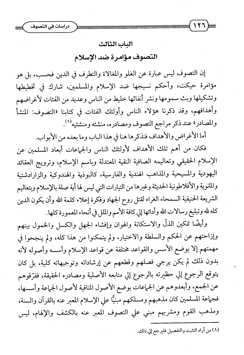 إن التصوف ليس عبارة عن الغلو والمغالاة والتطرف في الدين فحسب , بل هو مؤامرة حيكت وأحكم نسيجها ضد الإسلام والمسلمين , وشارك في تخطيطها وتشكيلها وبث سمومها ونشر أنفاثها خليط من الناس وعديد من الفئات لأغراضهم وأهدافهم , وقد ذكرنا هؤلاء الناس وأولئك الفئات في كتابنا ((التصوف .. المنشأ والمصادر)) عند ذكر مراجع التصوف ومصادره , منشئه ومنشئيه (¬1).