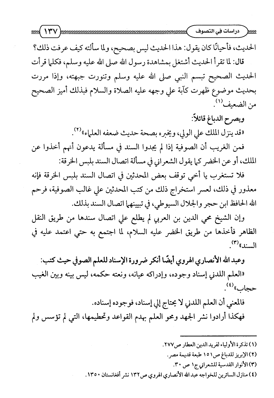 وعبد الله الأنصاري الهروي أيضًا أنكر ضرورة الإسناد للعلم الصوفي حيث كتب: " العلم اللدني إسناده وجوده , وإدراكه عيانه , ونعته حكمه , ليس بينه وبين الغيب حجاب " (¬4).