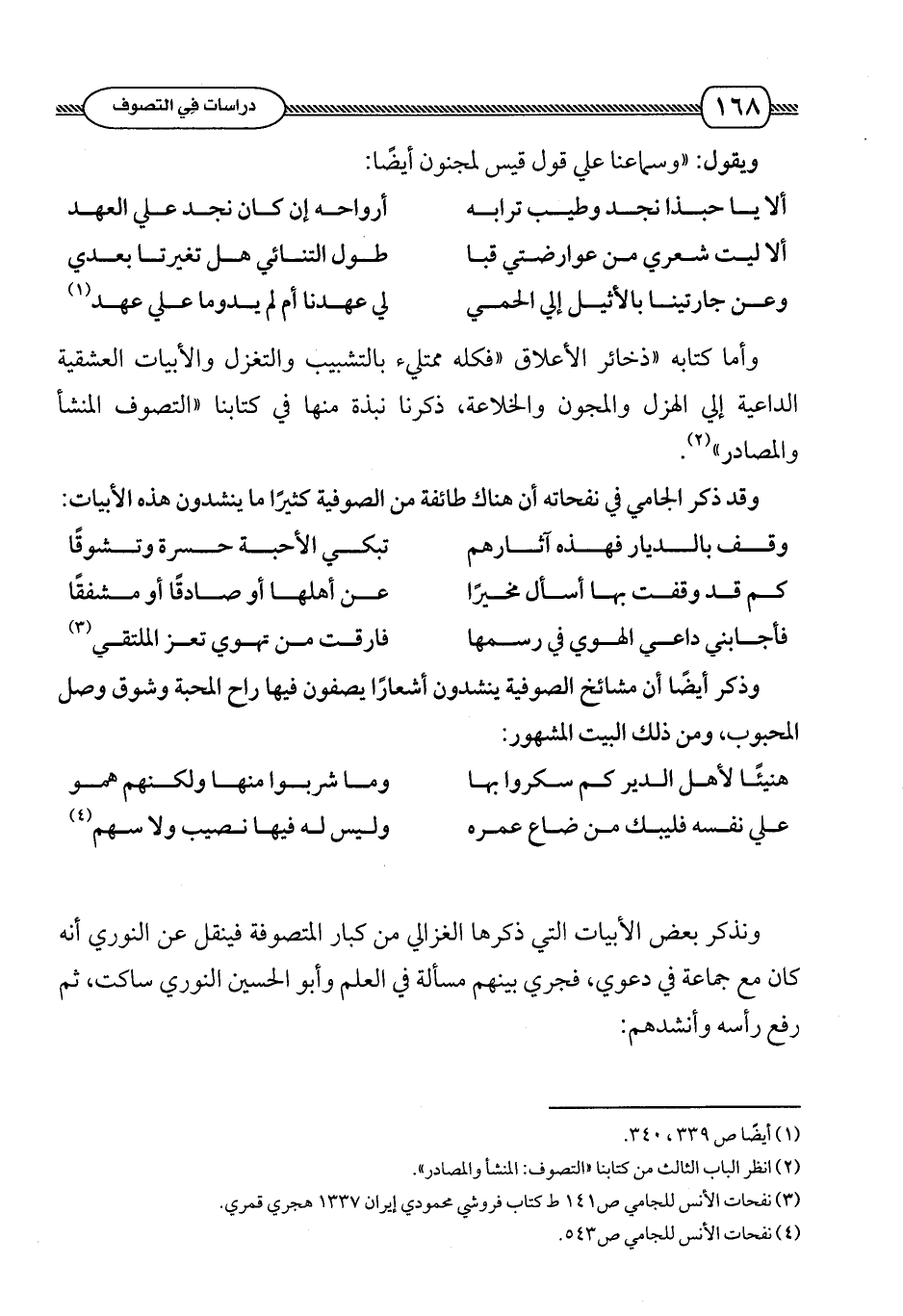 ونذكر بعض الأبيات التي ذكرها الغزالي من كبار المتصوفة فينقل عن النوري أنه كان مع جماعة في دعوى , فجرى بينهم مسألة في العلم وأبو الحسين النوري ساكت , ثم رفع رأسه وأنشدهم: