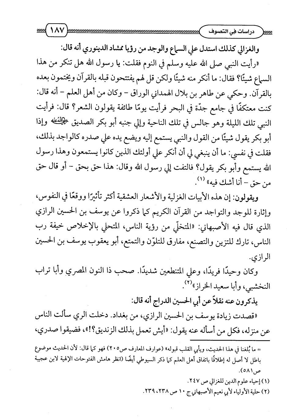 والغزالي كذلك استدلّ على السماع والوجد من رؤيا ممشاد الدينوري أنه قال: