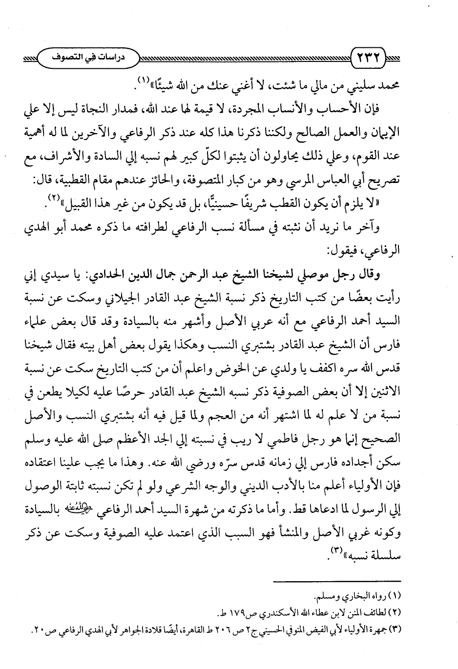 فإن الأحساب والأنساب المجردة، لا قيمة لها عند الله، فمدار النجاة ليس إلا على الإيمان والعمل الصالح ولكننا ذكرنا هذا كله عند ذكر الرفاعي والآخرين لما له أهمية عند القوم، وعلى ذلك يحاولون أن يثبتوا لكل كبير لهم نسبه إلى السادة والأشراف، مع تصريح أبي العباس المرسي وهو من كبار المتصوفة والحائز عندهم على مقام القطبية: " لا يلزم أن يكون القطب شريفاً حسينياً؛ بل قد يكون من غير هذا القبيل" (¬2).
