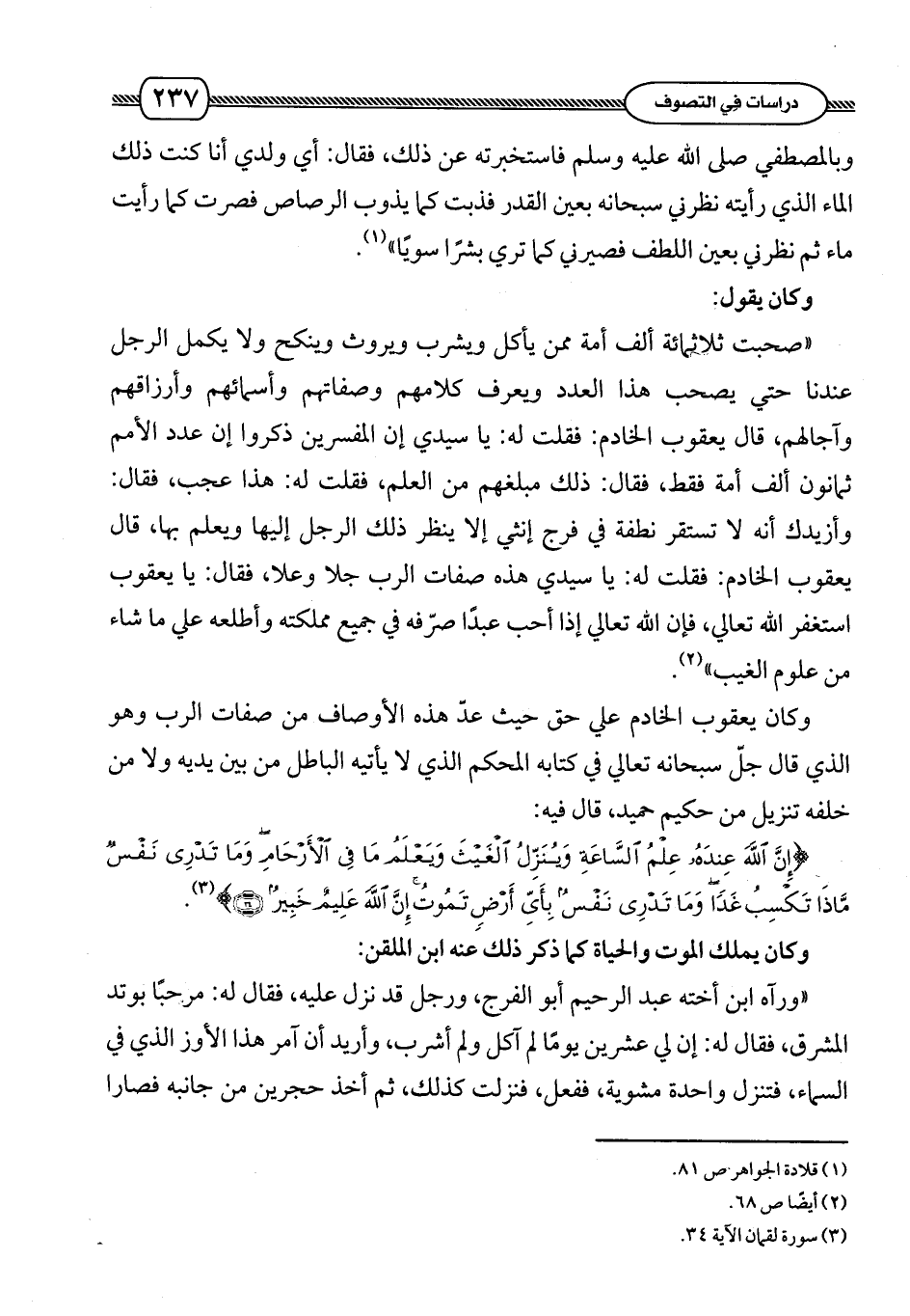 وكان يقول: " صحبت ثلاثمائة ألف أمة ممن يأكل ويشرب ويروث وينكح ولا يكمل الرجل عندنا حتى يصحب هذا العدد ويعرف كلامهم وصفاتهم وأسمائهم وأرزاقهم وآجالهم، قال يعقوب الخادم، فقلت له: يا سيدي إن المفسرين ذكروا إن عدد الأمم ثمانون ألف أمة فقط، فقال ذلك مبلغهم من العلم، فقلت له: هذا عجب. فقال: واز يدك أنه ى نستقر فطفة في فرج أنثى إلا ينظر ذلك الرجل إليها ويعلم بها. قال يعقوب الخادم فقلت له: يا سيدي هذه صفات الرب جل وعلا، فقال: يا يعقوب أستغفر الله تعالى فإن الله تعالى إذا أحب عبداً صرفه في جميع مملكته وأطلعه على ما شاء من علوم الغيب" (¬2).
