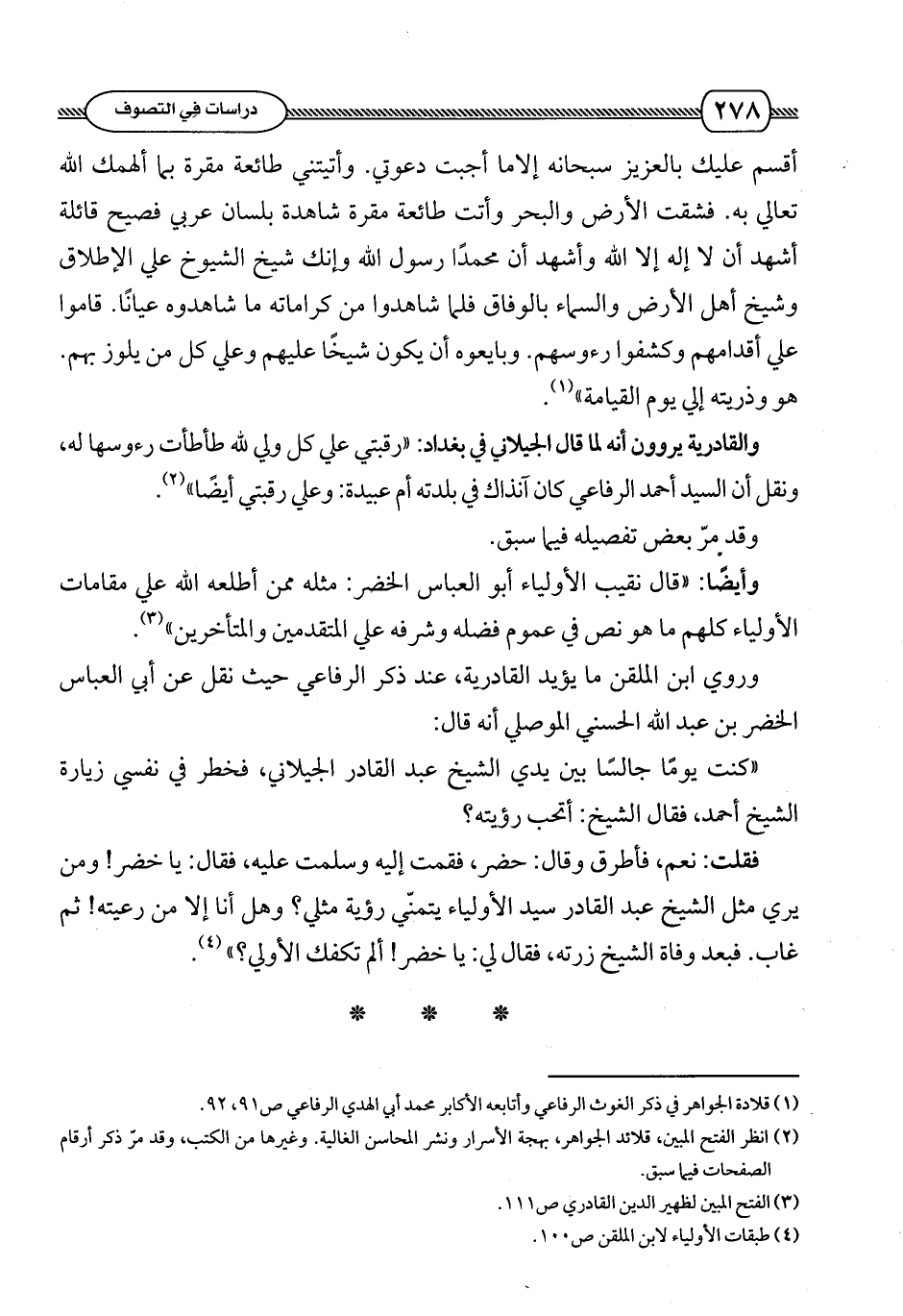 وروى ابن الملقن ما يؤيّد القادرية , عند ذكر الرفاعي حيث نقل عن أبي العباس الخضر بن عبد الله الحسني الموصلي أنه قال: