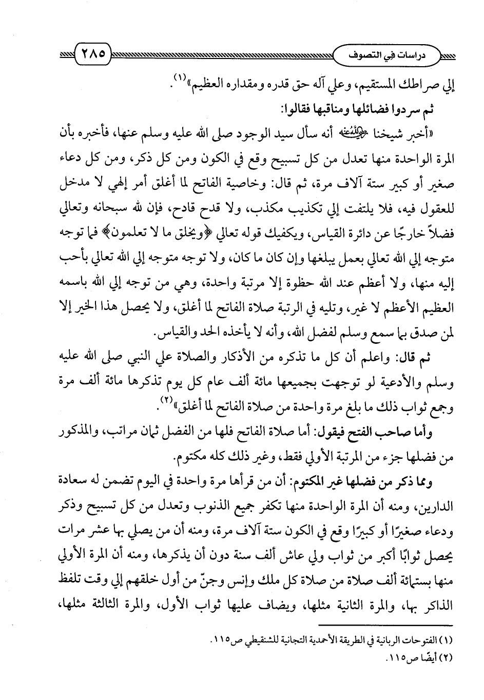 ثم قال: وأعلم أن كل ما تذكره من الأذكار والصلاة على النبي صلى الله عليه وسلم والأدعية لو توجهت بجميعها مائة ألف عام كل يوم تذكرها مائة ألف مرة وجمع ثواب ذلك ما بلغ مرة واحدة من صلاة الفاتح لما أغلق " (¬2).