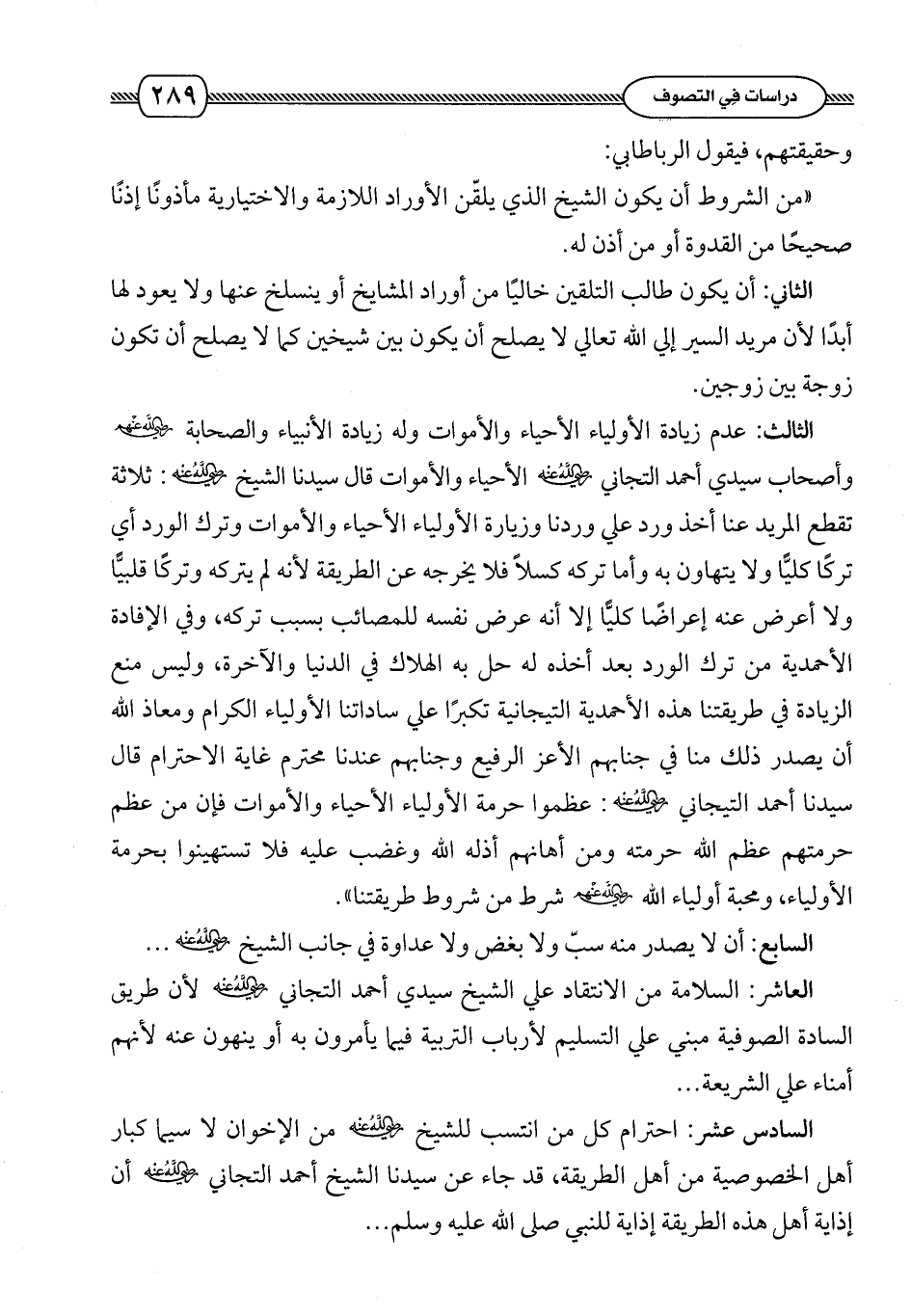 العاشر: السلامة من الانتقاد على الشيخ سيدي أحمد التيجاني رضي الله عنه لأن طريق السادة الصوفية مبني على التسليم لأرباب التربية فيما يأمرون به أو ينهون عنه لأنهم أمناء على الشريعة. . .