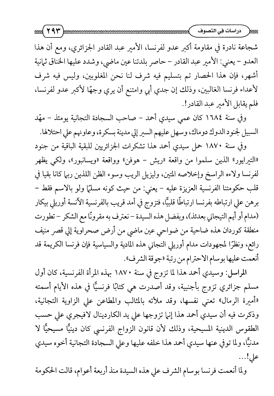 المراسل: وسيدي أحمد هذا لما تزوج في سنة 1870 بهذه المرأة الفرنسية , كان أول مسلم جزائري تزوج بأجنبية , وقد أصدرت هي كتاباً فرنسيّاً في هذه الأيام أسمته " أميرة الرمال " تعني نفسها , وقد ملأته بالمثالب والمطاعن على الزاوية التيجانية , وذكرت فيه أن سيدي أحمد هذا إنما تزوجها على يد الكاردينال لافيجري على حسب الطقوس الدينية المسيحية , وذلك لأن قانون الزواج الفرنسي كان دينياً مسيحياً لا مدنياً , ولما توفي عنها سيدي أحمد هذا خلفه عليها وعلى السجادة التيجانية أخوه سيدي علي!. . .