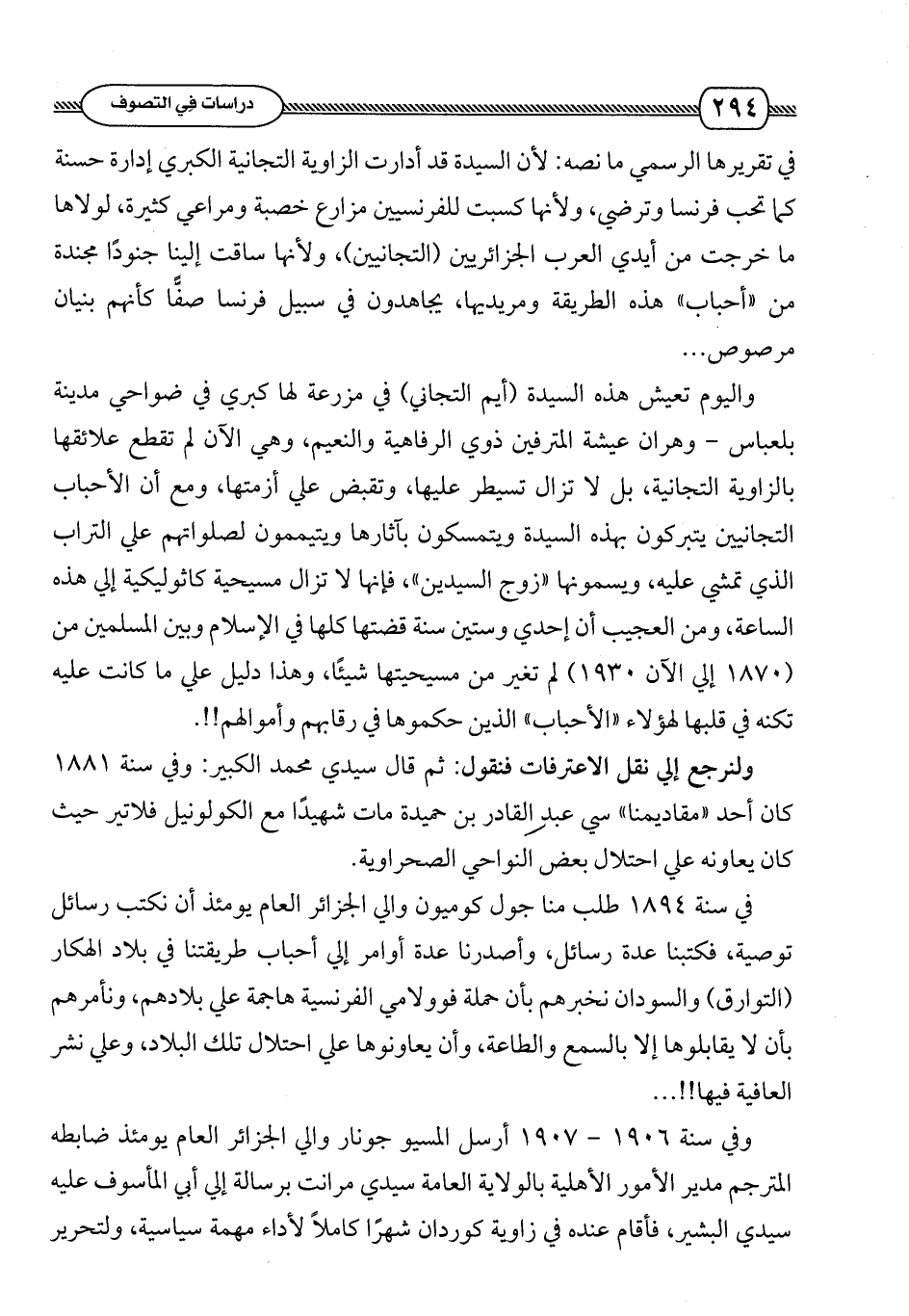 واليوم تعيش هذه السيدة (أيّم التجاني) في مزرعة لها كبرى في ضواحي مدينة بلعباس - وهران عيشة المترفين ذوي الرفاهية والنعيم , وهي الآن لم تقطع علائقها بالزاوية التجانية , بل لا تزال تسيطر عليها , وتقبض على أزمتها , ومع أن الأحباب التجانيين يتبركون بهذه السيدة ويتمسكون بآثارها ويتيممون لصلواتهم على التراب الذي تمشي عليه , ويسمونها " زوجة السيدين " , فإنها لا تزال مسيحية كاثوليكية إلى هذه الساعة , ومن العجيب أن إحدى وستين سنة قضتها كلها في الإسلام وبين المسلمين من (1870 إلى الآن 1930) لم تغير من مسيحيتها شيئاً , وهذا دليل على ما كانت عليه تكنه في قلبها لهؤلاء " الأحباب " الذين حكموها في رقابهم وأموالهم!!.