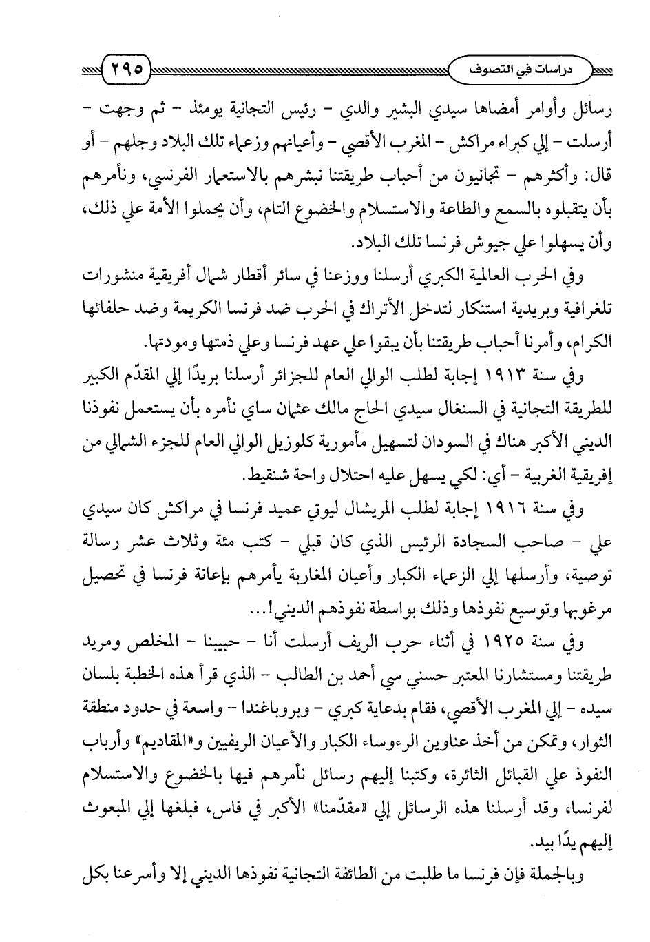 وفي سنة 1916 إجابة لطلب المريشال ليوتي عميد فرنسا في مراكش كان سيدي علي - صاحب السجادة الرئيس الذي كان قبلي - كتب مئة وثلاث عشرة رسالة توصية , وأرسلها إلى الزعماء الكبار وأعيان المغاربة يأمرهم بإعانة فرنسا في تحصيل مرغوبها وتوسيع نفوذها وذلك بواسطة نفوذهم الديني!. . .