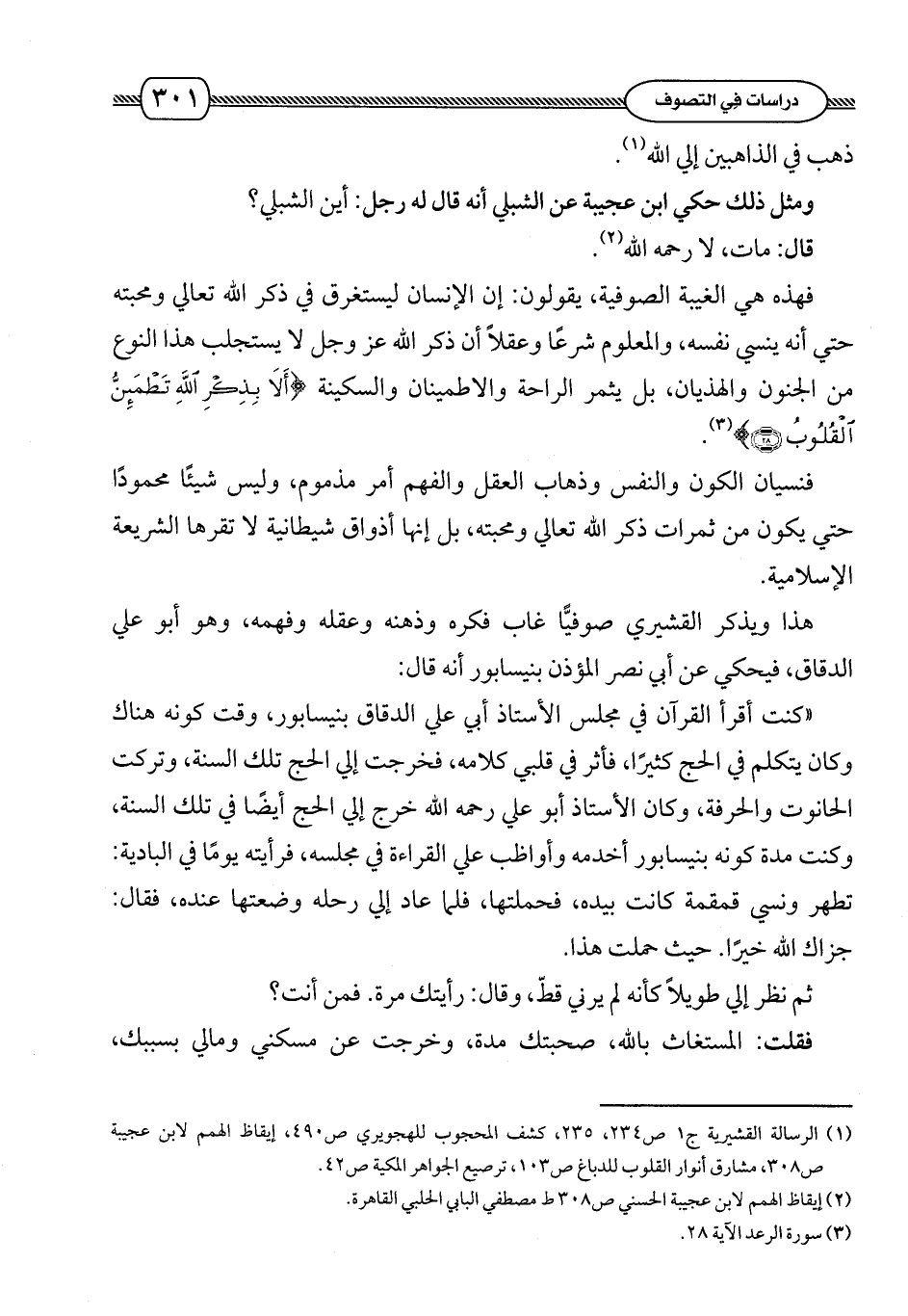 فهذه هي الغيبة الصوفية , يقولون: أن الإنسان ليستغرق في ذكر الله تعالى ومحبته حتى أنه ينسى نفسه , والمعلوم شرعاً وعقلاً أن ذكر الله عز وجل لا يستجلب هذا النوع من الجنون والهذيان , بل يثمر الراحة والاطئنان والسكينة {ألا بذكر الله تطمئن القلوب} (¬3).