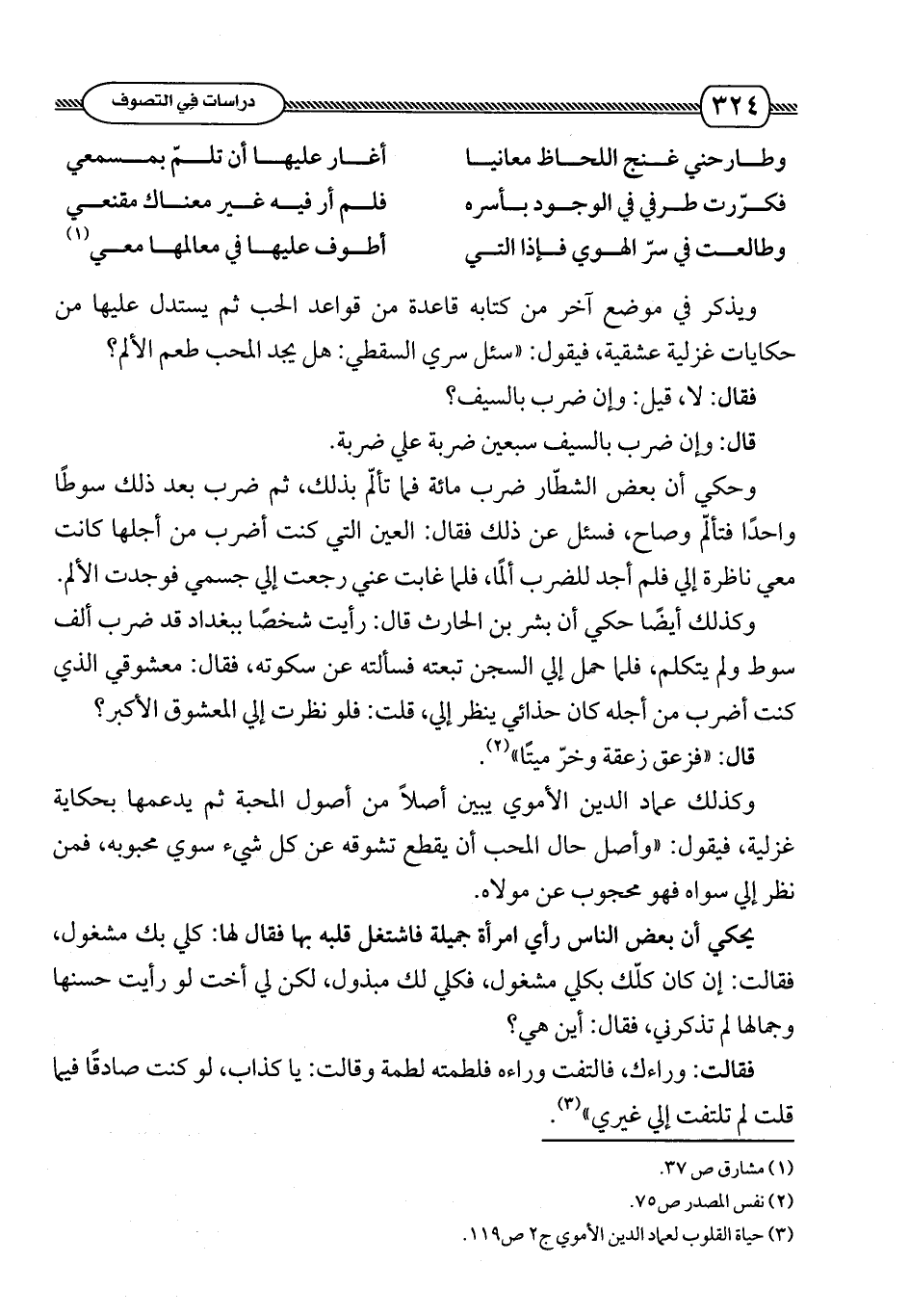 وكذلك أيضاً حكي أن بشر بن الحارث قال: رأيت شخصاً ببغداد قد ضرب ألف سوط ولم يتكلم , فلما حمل إلى السجن تبعته فسألته عن سكوته , فقال: معشوقي الذي كنت أضرب من أجله كان حذائي ينظر إليّ , قلت: فلو نظرت إلى المعشوق الأكبر؟