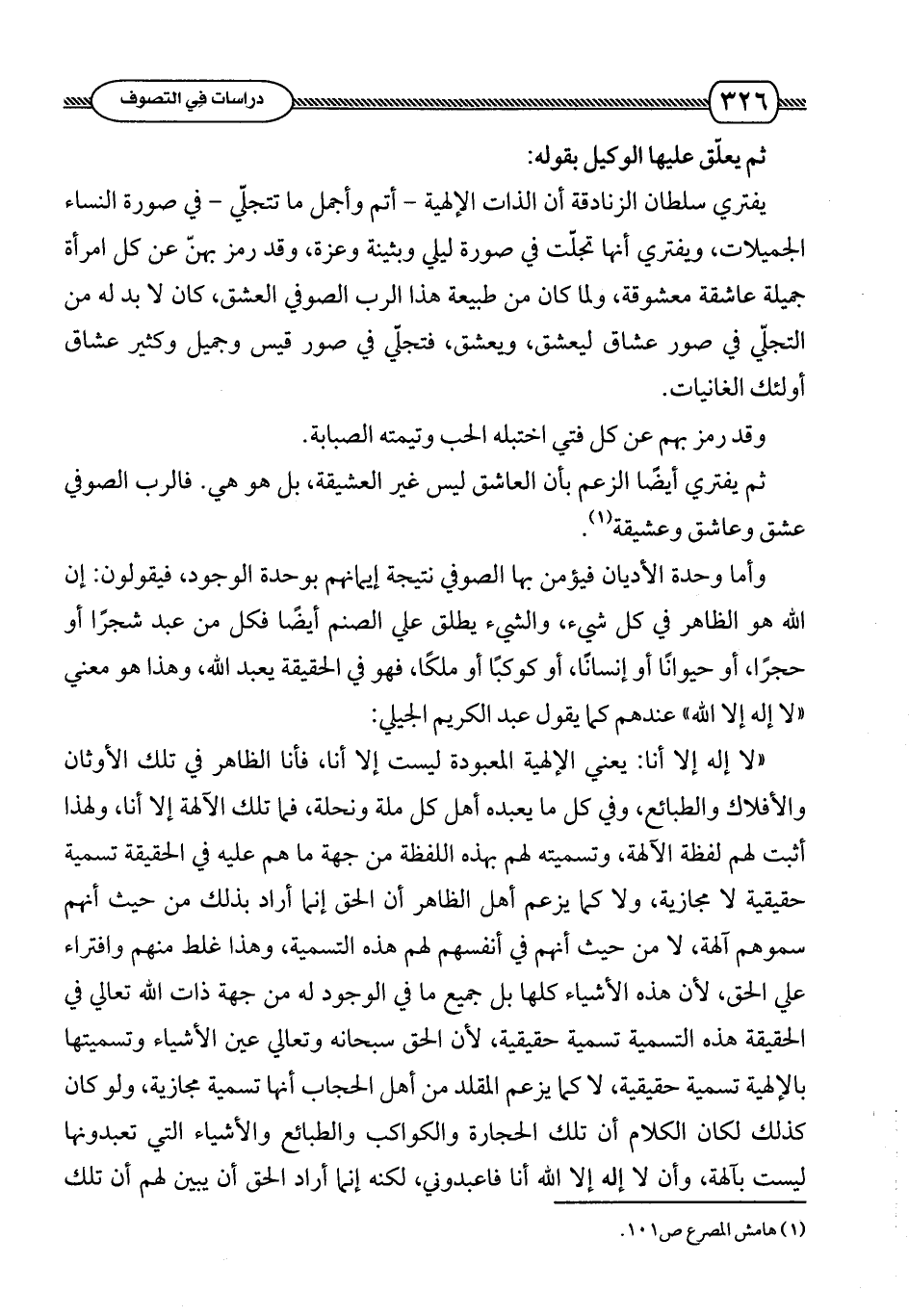 يفتري سلطان الزنادقة أن الذات الإلهية - أتم وأجمل ما تتجلّى - في صورة النساء الجميلات , ويفتري أنها تجلّت في صورة ليلى وبثينة وعزة , وقد رمز بهنّ عن كل أمرأة جميلة عاشقة معشوقة , ولما كان من طبيعة هذا الرب الصوفي العشق , كان لا بد له من التجلّي في صور عشاق ليعشق , ويعشق , فتجلّى في صور قيس وجميل وكثير عشاق أولئك الغانيات.