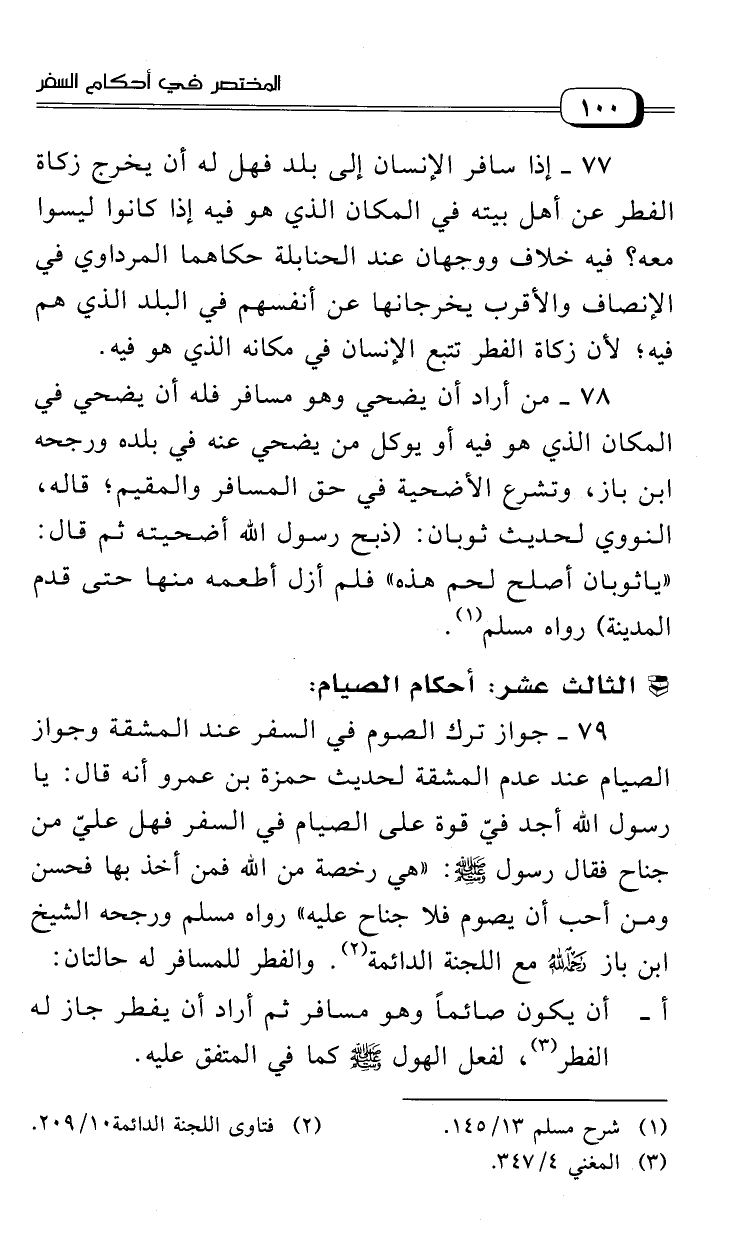 77 - من أراد أن يضحي وهو مسافر فله أن يضحي في المكان الذي هو فيه أو يوكل من يضحي عنه في بلده ورجحه ابن باز، وتشرع الأضحية في حق المسافر والمقيم؛ قاله النووي لحديث ثوبان: "ذبح رسول الله أضحيته ثم قال: «يا ثوبان أصلح لحم هذه» فلم أزل أطعمه منها حتى قدم المدينة" رواه مسلم (¬1).