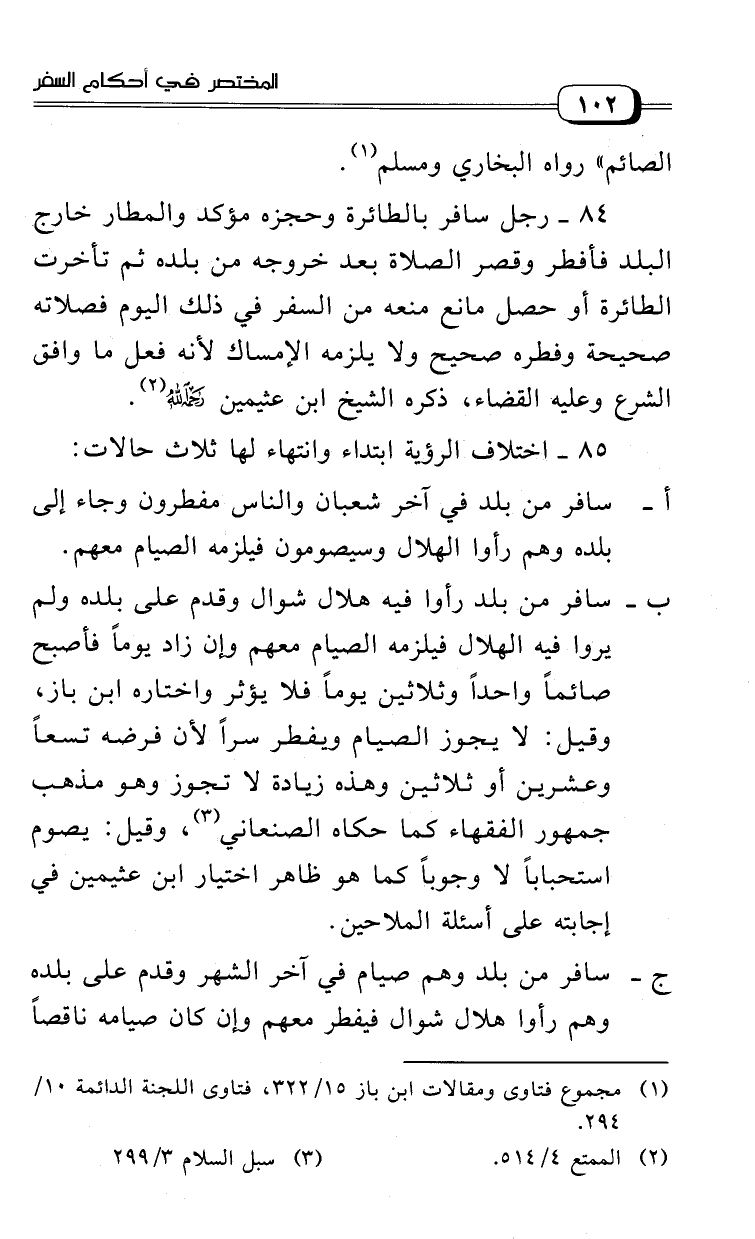 83 - رجل سافر بالطائرة وحجزه مؤكد والمطار خارج البلد فأفطر وقصر الصلاة بعد خروجه من بلده ثم تأخرت الطائرة أو حصل مانع منعه من السفر في ذلك اليوم فصلاته صحيحة وفطره صحيح ولا يلزمه الإمساك، لأنه فعل ما وافق الشرع وعليه القضاء، ذكره الشيخ ابن عثيمين رحمه الله (¬2).