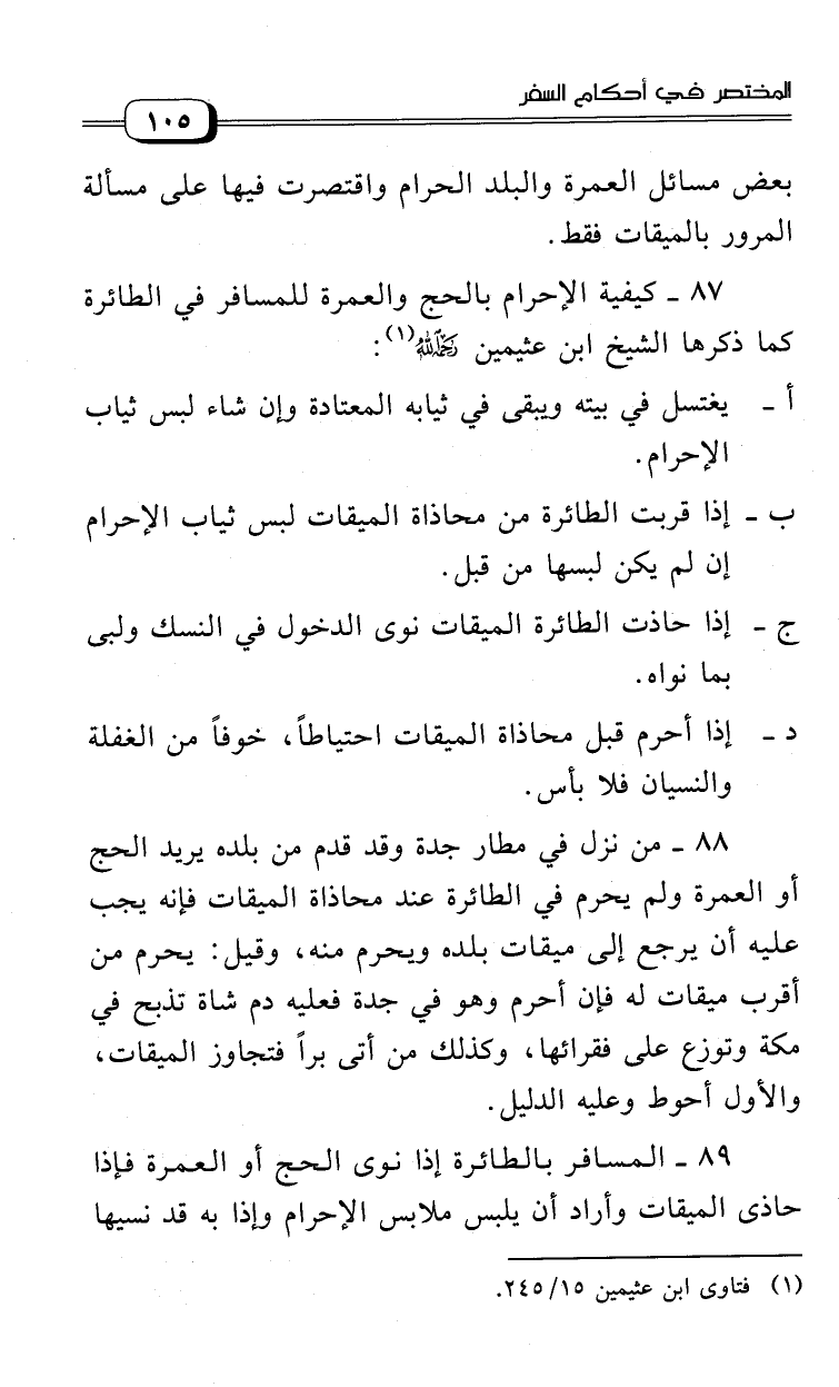 87 - من نزل في مطار جدة وقد قدم من بلد يريد الحج أو العمرة ولم يحرم في الطائرة عند محاذاة الميقات، فإنه يجب عليه أن يرجع إلى ميقات بلده ويحرم منه، وقيل: يحرم من أقرب ميقات له فإن أحرم وهو في جدة فعليه دم شاة تذبح في مكة وتوزع على فقرائها، وكذلك من أتى برا فتجاوز الميقات، والأول أحوط وعليه الدليل.