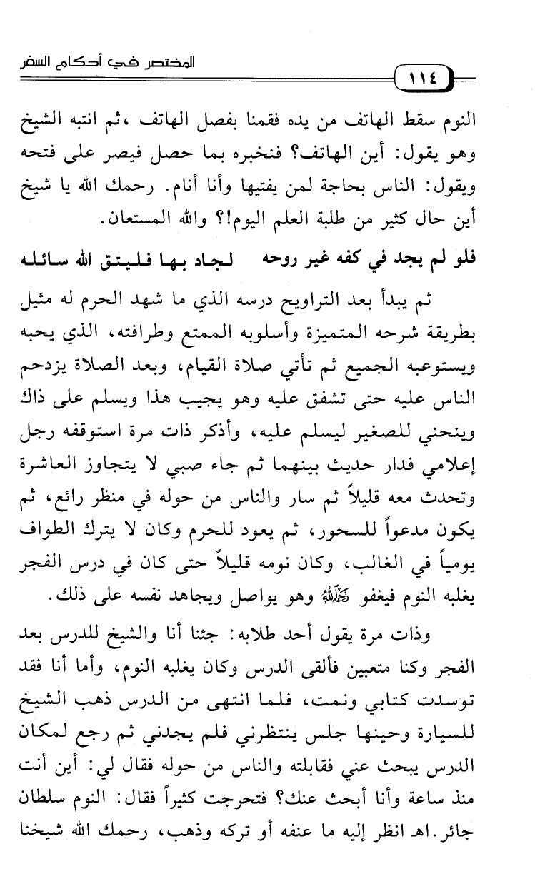 النوم سقط الهاتف من يده فقمنا بفصل الهاتف، ثم انتبه الشيخ وهو يقول: أين الهاتف؟ فنخبره بما حصل، فيصر على فتحه ويقول: الناس بحاجة لمن يفتيها وأنا أنام. رحمك الله يا شيخ أين حال كثير من طلبة العلم اليوم؟! والله المستعان.