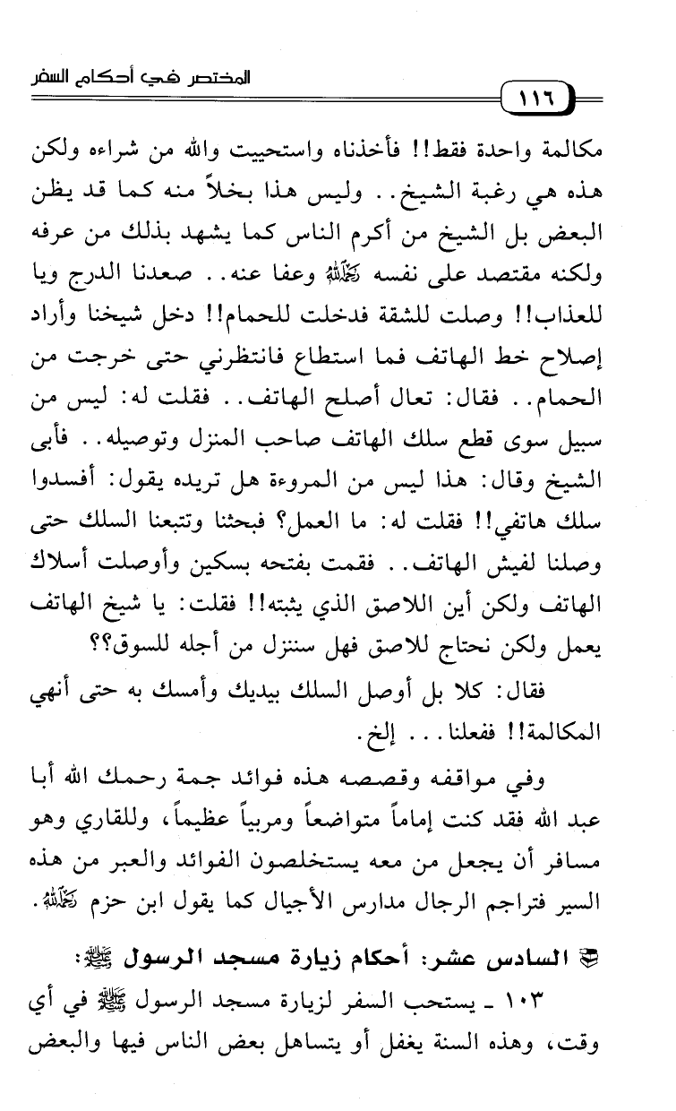 مكالمة واحدة فقط!! فأخذناه، واستحييت والله من شرائه ولكن هذه هي رغبة الشيخ .. وليس هذا بخلا منه كما قد يظن البعض، بل الشيخ من أكرم الناس كما يشهد بذلك من عرفه، ولكنه مقتصد على نفسه رحمه الله وعفا عنه .. صعدنا الدرج ويا للعذاب!! وصلت للشقة فدخلت للحمام!! دخل شيخنا وأراد إصلاح خط الهاتف فما استطاع فانتظرني حتى خرجت من الحمام .. فقال تعال أصلح الهاتف .. فقلت له: ليس من سبيل سوى قطع سلك هاتف صاحب المنزل وتوصيله .. فأبى الشيخ وقال: هذا ليس من المروءة هل تريده يقول: أفسدوا سلك هاتفي!! فقلت له: ما العمل؟ فبحثنا وتتبعنا السلك حتى وصلنا لفيش الهاتف .. فقمت بفتحه بسكين وأوصلت أسلاك الهاتف ولكن أين اللاصق الذي يثبته!! فقلت: يا شيخ الهاتف يعمل ولكن نحتاج للاصق فهل سننزل من أجله للسوق؟؟