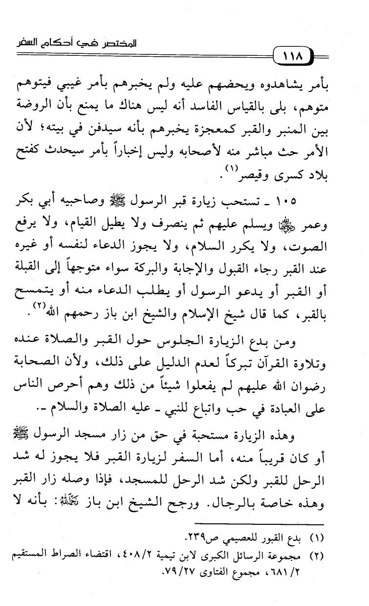 97 - تستحب زيارة قبر الرسول - صلى الله عليه وسلم - وصاحبيه أبي بكر وعمر رضي الله عنهما ويسلم عليهم ثم ينصرف ولا يطيل القيام، ولا يرفع الصوت، ولا يكرر السلام، ولا يجوز الدعاء لنفسه أو غيره عند القبر رجاء القبول والإجابة والبركة سواء متوجها إلى القبلة أو القبر أو يدعو الرسول أو يطلب الدعاء منه أو يتمسح بالقبر، كما قال شيخ الإسلام والشيخ ابن باز رحمهما الله (¬2).