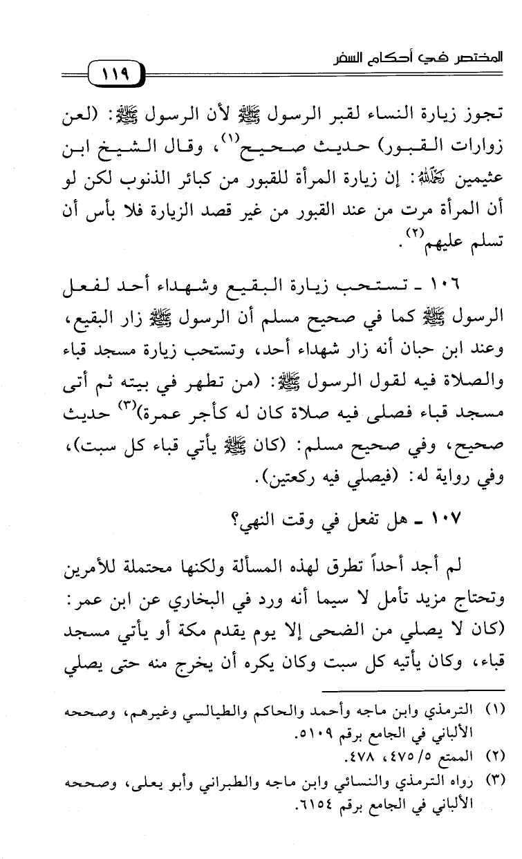 98 - تستحب زيارة البقيع وشهداء أحد لفعل الرسول - صلى الله عليه وسلم - كما في صحيح مسلم أن الرسول - صلى الله عليه وسلم - زار البقيع، وعند ابن حبان أنه زار شهداء أحد، وتستحب زيارة مسجد قباء والصلاة فيه لقول الرسول - صلى الله عليه وسلم -: «من تطهر في بيته ثم أتى مسجد قباء فصلى فيه صلاة كان له كأجر عمرة» (¬3) حديث صحيح، وفي صحيح مسلم: «كان - صلى الله عليه وسلم - يأتي قباء كل سبت»، وفي رواية له: «فيصلي فيه ركعتين».