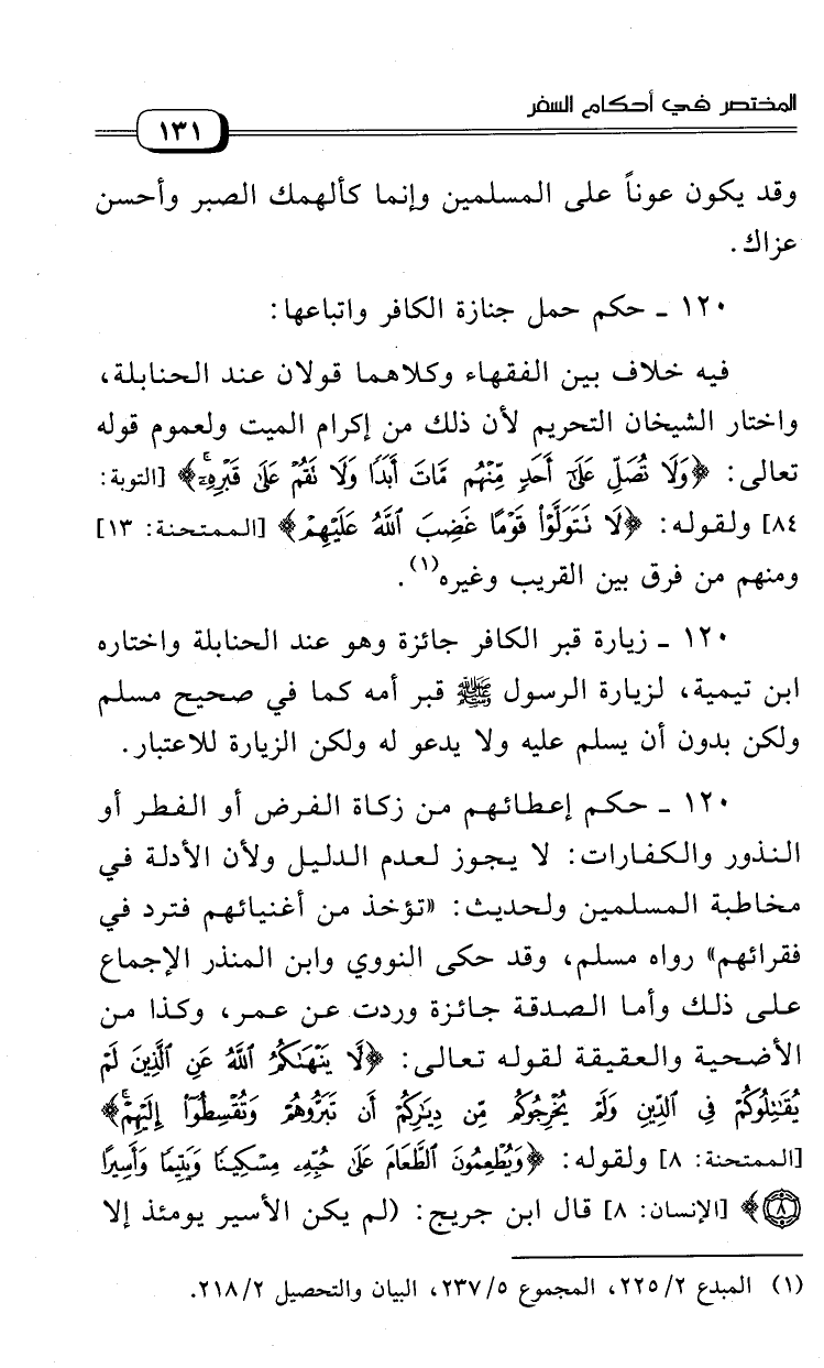 118 - زيارة قبر الكافر جائزة وهو عند الحنابلة واختاره ابن تيمية، لزيارة الرسول - صلى الله عليه وسلم - قبر أمه كما في صحيح مسلم ولكن بدون أن يسلم عليه ولا يدعو له ولكن الزيارة للاعتبار.
