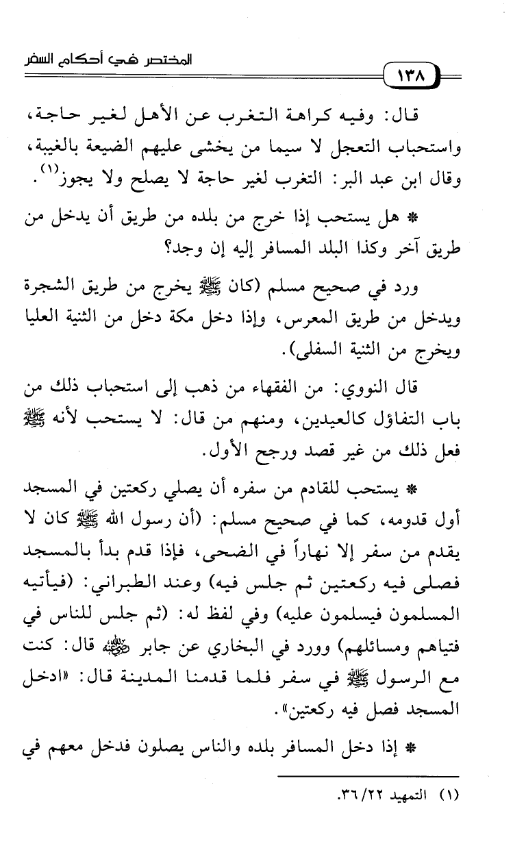 * يستحب للقادم من سفره أن يصلي ركعتين في المسجد أول قدومه، كما في صحيح مسلم: "أن رسول الله - صلى الله عليه وسلم - كان لا يقدم من سفر إلا نهارا في الضحى، فإذا قدم بدأ بالمسجد فصلى فيه ركعتين ثم جلس فيه" وعند الطبراني: "فيأتيه المسلمون فيسلمون عليه" وفي لفظ له: "ثم جلس للناس في فتياهم ومسائلهم" وورد في البخاري عن جابر رضي الله عنه قال: كنت مع الرسول - صلى الله عليه وسلم - في سفر فلما قدمنا المدينة قال: «ادخل المسجد فصل فيه ركعتين».
