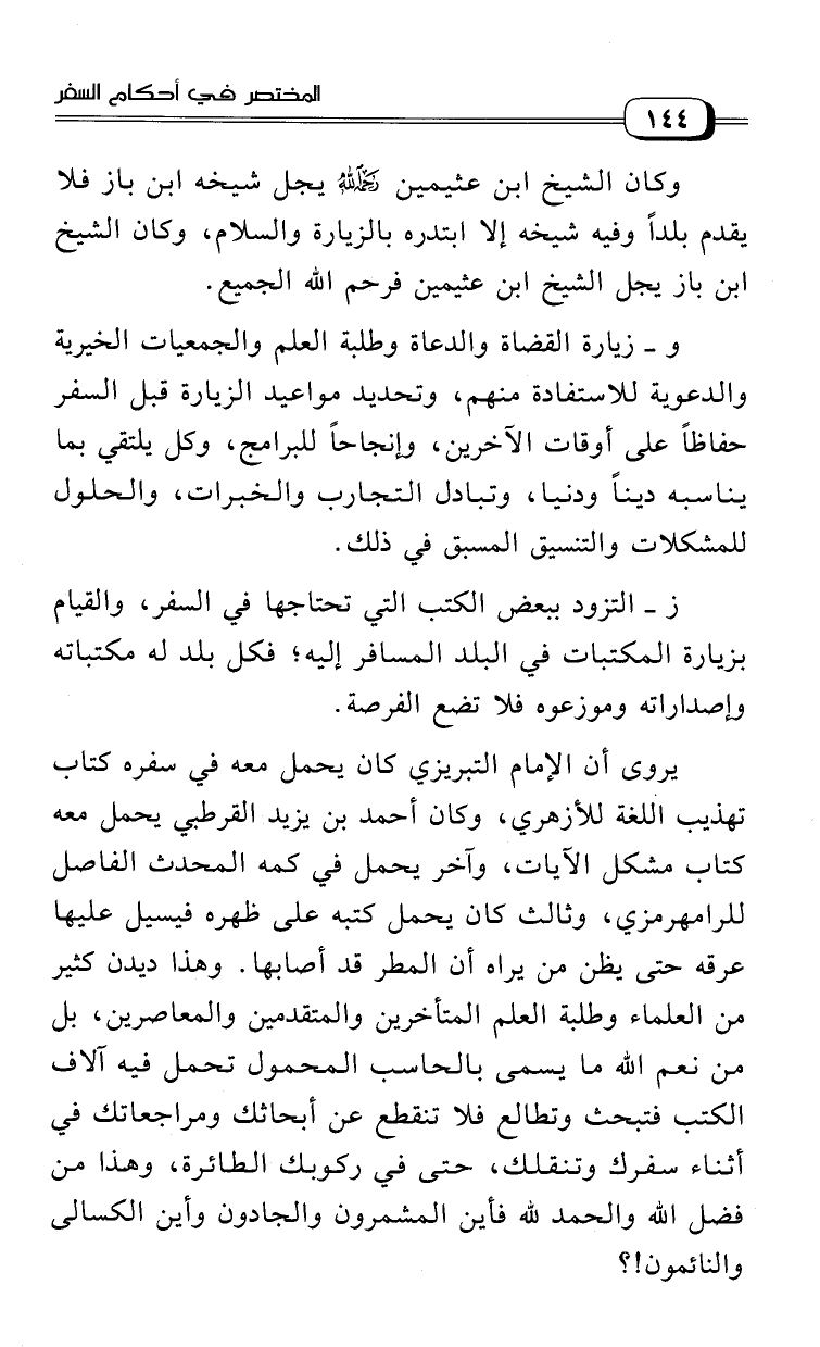 ز- التزود ببعض الكتب التي تحتاجها في السفر، والقيام بزيارة المكتبات في البلد المسافر إليه؛ فكل بلد له مكتباته وإصداراته وموزعوه فلا تضع الفرصة.