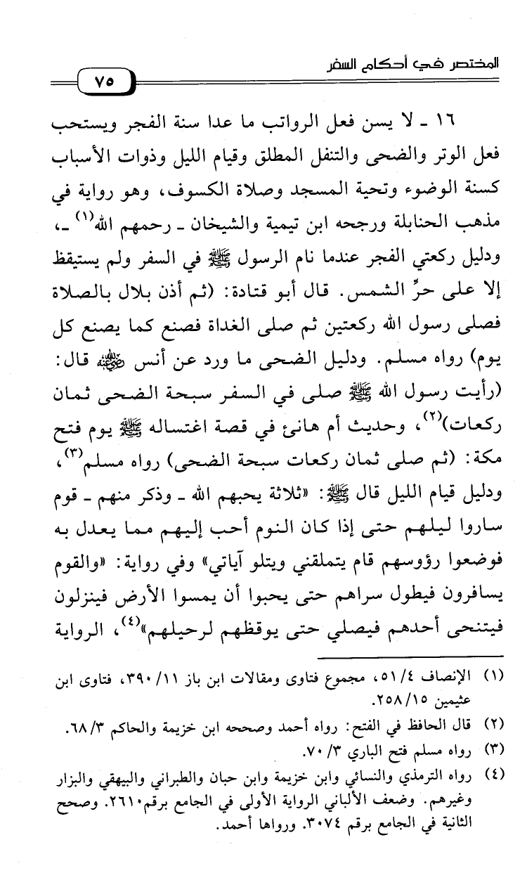 16 - لا يسن فعل الرواتب ما عدا سنة الفجر ويستحب فعل الوتر والضحى والتنفل المطلق وقيام الليل وذوات الأسباب كسنة الوضوء وتحية المسجد وصلاة الكسوف، وهو رواية في مذهب الحنابلة ورجحه ابن تيمية والشيخان ـ رحمهم الله (¬1) ـ ودليل ركعتي الفجر عندما نام الرسول - صلى الله عليه وسلم - في السفر ولم يستيقظ إلا على حر الشمس. قال أبو قتادة: "ثم أذن بلال بصلاة فصلى رسول الله ركعتين ثم صلى الغداة فصنع كما يصنع كل يوم" رواه مسلم. ودليل الضحى ما ورد عن أنس رضي الله عنه قال: "رأيت رسول الله - صلى الله عليه وسلم - صلى في السفر سبحة الضحى ثمان ركعات" (¬2)، وحديث أم هانئ في قصة اغتساله - صلى الله عليه وسلم - يوم فتح مكة: "ثم صلى ثمان ركعات سبحة الضحى" رواه مسلم (¬3)، ودليل قيام الليل قال - صلى الله عليه وسلم -: «ثلاثة يحبهم الله ـ وذكر منهم ـ قوم ساروا ليلهم حتى إذا كان النوم أحب إليهم مما يعدل به فوضعوا رؤوسهم قام يتملقني ويتلو آياتي» وفي رواية: «والقوم يسافرون فيطول سراهم حتى يحبوا أن يمسوا الأرض فينزلون فيتنحى أحدهم فيصلي حتى يوقظهم لرحيلهم» (¬4)، الرواية
