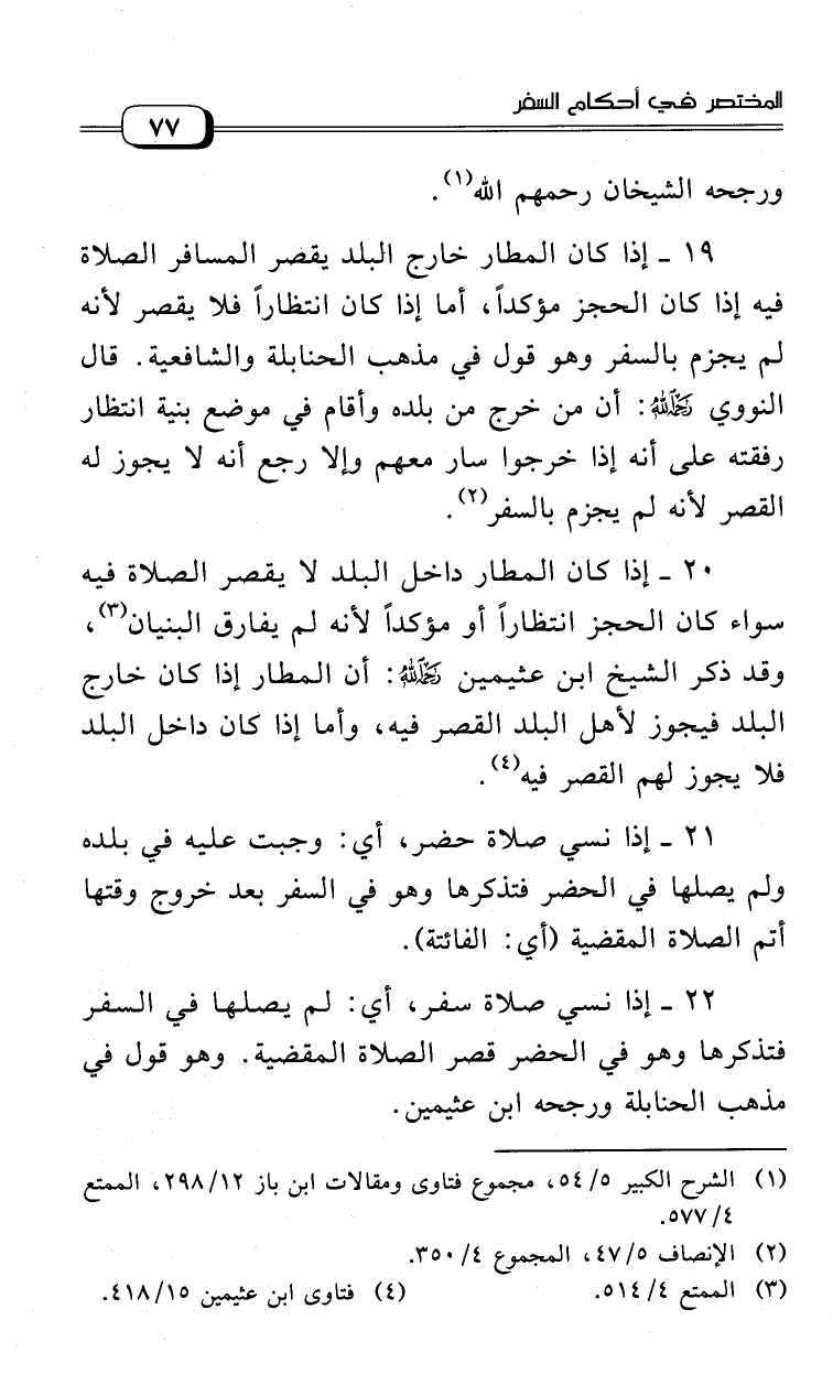 19 - إذا كان المطار خارج البلد يقصر المسافر الصلاة فيه إذا كان الحجز مؤكدا، أما إذا كان انتظارا فلا يقصر لأنه لم يجزم بالسفر وهو قول في مذهب الحنابلة والشافعية. قال النووي رحمه الله: "إن من خرج من بلده وأقام في موضع بنية انتظار رفقته على أنه إذا خرجوا سار معهم وإلا رجع أنه لا يجوز له القصر لأنه لم يجزم بالسفر" (¬2).