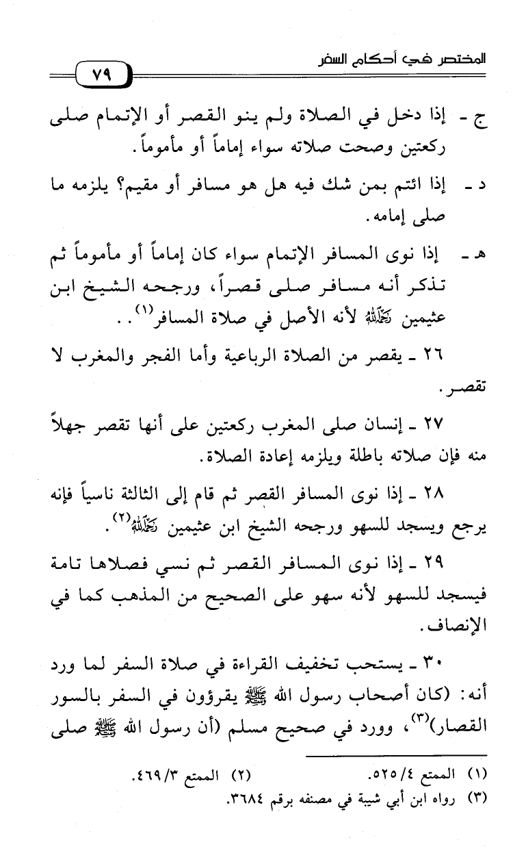 28 - إذا نوى المسافر القصر ثم قام إلى الثالثة ناسيا فإنه يرجع ويسجد للسهو ورجحه الشيخ ابن عثيمين رحمه الله (¬2).