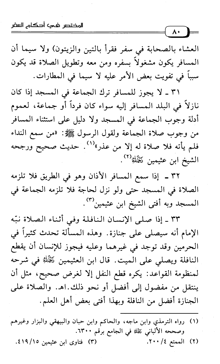 31 - لا يجوز للمسافر ترك الجماعة في المسجد إذا كان نازلا في البلد المسافر إليه سواء كان فردا أو جماعة، لعموم أدلة وجوب الجماعة في المسجد ولا دليل على استثناء المسافر من وجوب صلاة الجماعة ولقول الرسول - صلى الله عليه وسلم -: «من سمع النداء فلم يأته فلا صلاة له إلا من عذر» (¬1). حديث صحيح ورجحه الشيخ ابن عثيمين رحمه الله (¬2).