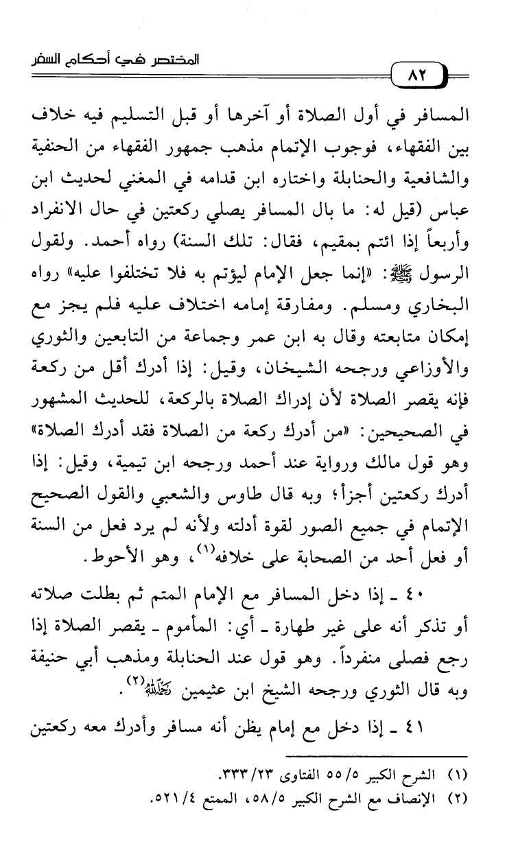 40 - إذا دخل المسافر مع الإمام المتم ثم بطلت صلاته أو تذكر أنه على غير طهارة ـ أي: المأمور ـ يقصر الصلاة إذا رجع فصلى منفردا. وهو قول عند الحنابلة ومذهب أبي حنيفة وبه قال الثوري ورجحه الشيخ ابن عثيمين رحمه الله (¬2).