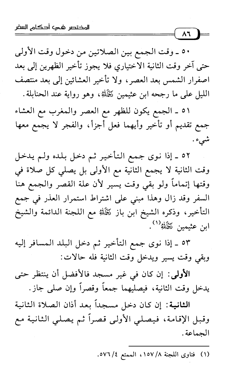 52 - إذا نوى جمع التأخير ثم دخل بلده ولم يدخل وقت الثانية لا يجمع الثانية مع الأولى بل يصلي كل صلاة في وقتها إتماما لو بقي وقت يسير لأن علة القصر والجمع هنا السفر وقد زال وهذا مبني على اشتراط استمرار العذر في جمع التأخير، وذكره الشيخ ابن باز رحمه الله مع اللجنة الدائمة الشيخ ابن عثيمين رحمه الله (¬1).