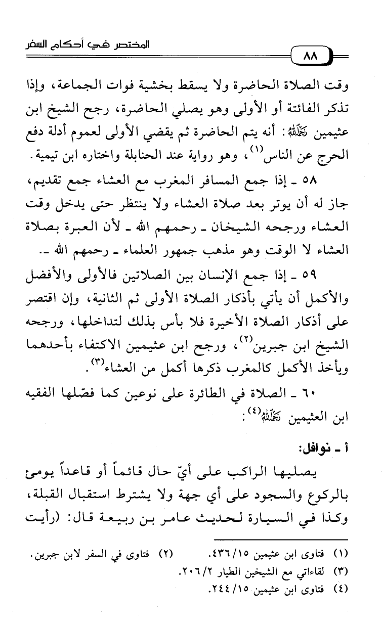 58 - إذا جمع المسافر المغرب مع العشاء جمع تقديم، جاز له أن يوتر بعد صلاة العشاء ولا ينتظر حتى يدخل وقت العشاء، ورجحه الشيخان ـ رحمهم الله ـ لأن العبرة بصلاة العشاء لا الوقت وهو مذهب جمهور العلماء ـ رحمهم الله.