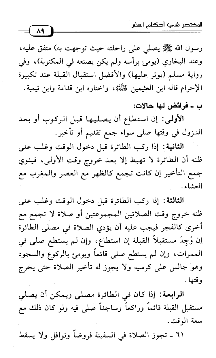 الثالثة: إذا ركب الطائرة قبل دخول الوقت وغلب على ظنه خروج وقت الصلاتين المجموعتين أو صلاة لا تجمع مع أخرى كالفجر فيجب عليه أن يؤدي الصلاة في مصلى الطائرة إن وجد مستقبلا القبلة إن استطاع، وإن لم يستطع صلى في الممرات، وإن لم يستطع صلى قائما ويومئ بالركوع والسجود وهو جالس على كرسيه ولا يجوز له تأخير الصلاة حتى يخرج وقتها.