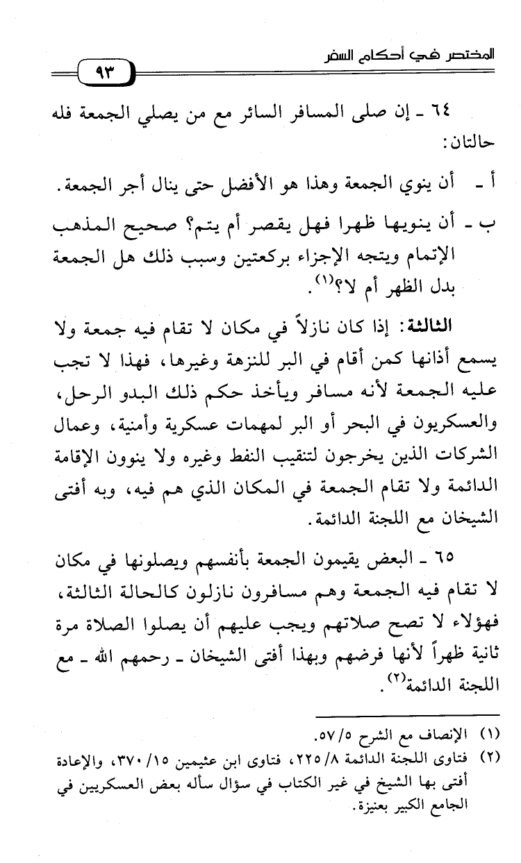 64 - إن صلى المسافر السائر مع من يصلي الجمعة فله حالتان: