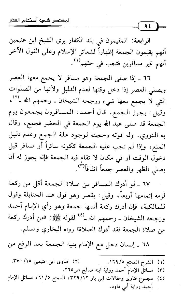 67 - لو أدرك المسافر من صلاة الجمعة أقل من ركعة لزمه إتمامها أربعا، وقيل: يقصر وهو قول عند الحنابلة وقول للمالكية، فإن أدرك ركعة أتمها جمعة وهو رأي الإمام أحمد ورجحه الشيخان ـ رحمهما الله ـ (¬4) لقوله - صلى الله عليه وسلم -: «من أدرك ركعة من صلاة الجمعة فقد أدرك الصلاة» رواه البخاري ومسلم.