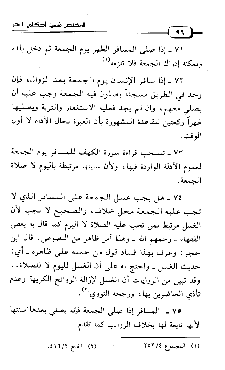 72 - إذا سافر الإنسان يوم الجمعة بعد الزوال، فإن وجد في الطريق مسجدا يصلون فيه الجمعة وجب عليه أن يصلي معهم، وإن لم يجد فعليه الاستغفار والتوبة ويصليها ظهرا ركعتين للقاعدة المشهورة بأن العبرة بحال الأداء لا أول الوقت.