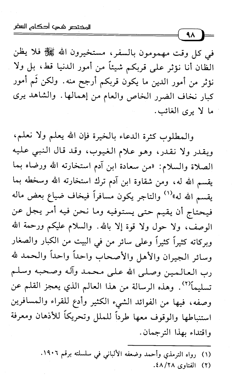 والمطلوب كثرة الدعاء بالخيرة فإن الله يعلم ولا نعلم، ويقدر ولا نقدر، وهو علام الغيوب، وقد قال النبي عليه الصلاة والسلام: «من سعادة ابن آدم استخارته الله ورضاه بما يقسم الله له، ومن شقاوة ابن آدم ترك استخارته الله وسخطه بما يقسم الله له» (¬1) والتاجر يكون مسافرا فيخاف ضياع بعض ماله فيحتاج أن يقيم حتى يستوفيه وما نحن فيه أمر يجل عن الوصف، ولا حول ولا قوة إلا بالله. والسلام عليكم ورحمة الله وبركاته كثيرا كثيرا وعلى سائر من في البيت من الكبار والصغار وسائر الجيران والأهل والأصحاب واحدا واحدا والحمد لله رب العالمين وصلى الله على محمد وآله وصحبه وسلم تسليما (¬2).