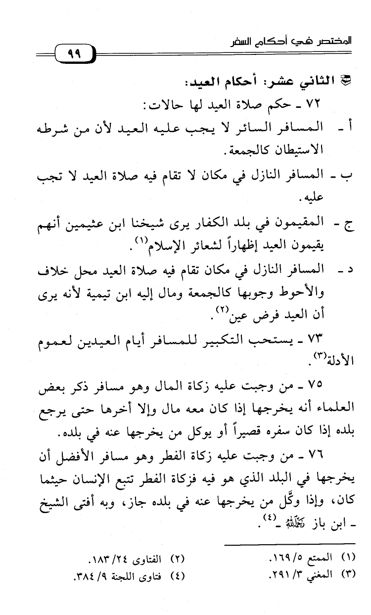 73 - يستحب التكبير للمسافر أيام العيدين لعموم الأدلة (¬3).