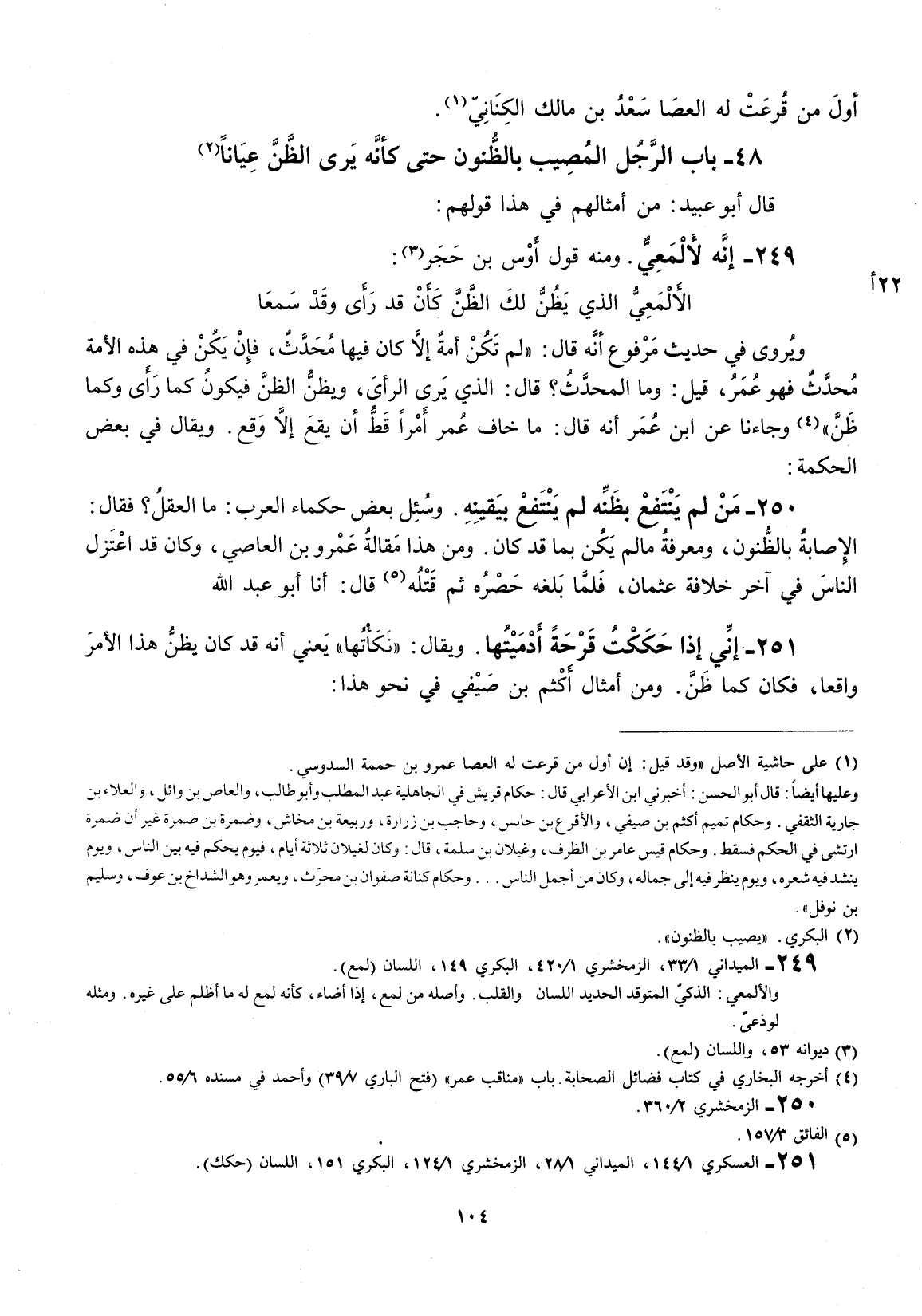 ومنه قول أوس بن حجر: الألمعي الذي يظن لك الظن كأنَّ قد رأى وقد سمعا ويروى في حديث مرفوع إنّه قال: لم تكن أمة إلاّ كان فيها محدث، فإنَّ يكن في هذه الأمة محدث فهو عمر، قيل: وما المحدث؟ قال: الذي يرى الرأي، ويظم الظن فيكون كما رأى وكما ظن وجاءنا عن عمر إنّه قال: ما خاف عمر أمراً قط أنَّ يقع إلاّ وقع. ويقال في بعض الحكمة: من لم ينتفع بظنه لم ينتفع بيقينه.