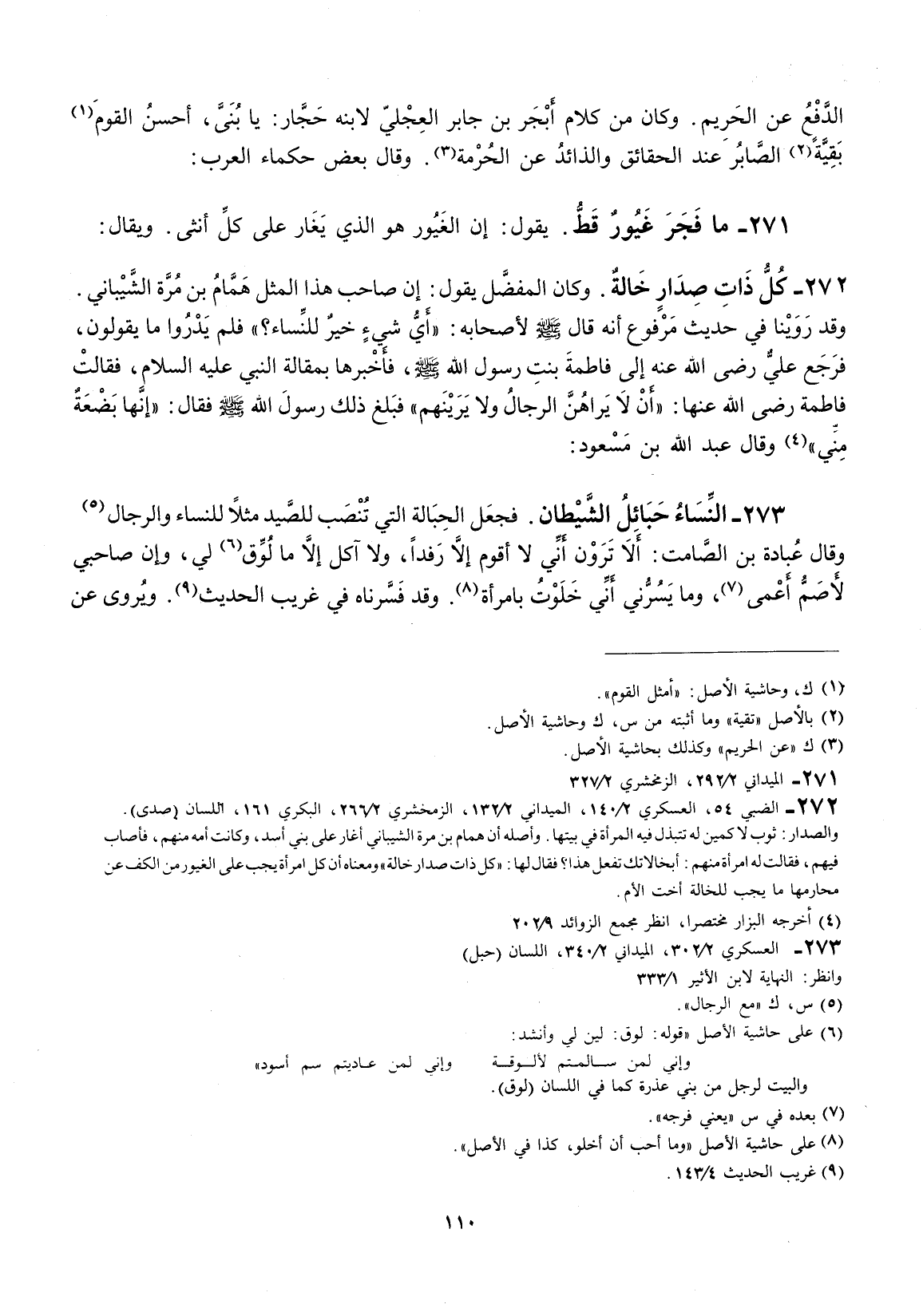 وكان المفضل يقول: إنَّ صاحب هذا المثل همام بن مرة الشيباني. وقد روينا في حديث مرفوع إنّه قال صَلَّى اللهُ عَلَيْهِ وَسَلَّمَ لأصحابه: " أي شيء خير للنساء؟ " فلم يدروا ما يقولون، فرجع علي رضي الله عنه إلى فاطمة بنت رسول الله صَلَّى اللهُ عَلَيْهِ وَسَلَّمَ، فأخبرها بمقالة النبي عليه السلام، فقالت فاطمة رضي الله عنها: " أنَّ لا يراهن الرجال ولا يرينهم " فبلغ ذلك رسول صَلَّى اللهُ عَلَيْهِ وَسَلَّمَ فقال: " إنّها بضعة مني " وقال عبد الله بن مسعود: النساء حبائل الشيطان.