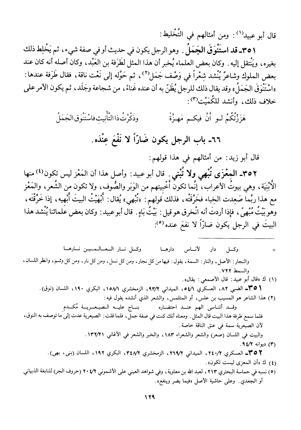 قال أبو عبيد: وأصل هذا إنَّ المعز ليس تكون منها الأبنية، وهي بيوت الأعراب، وإنّما تكون أخبيتهم من الوبر والصوف، ولا تكون من الشعر، والمعز مع هذا ربما صعدت الخباء فخرقته، فلذلك قولهم: " تبهي " يقال: أبهيت البيت أبهيه، إذا خرقته، وهو بيت مبهى، فإذا أردت إنّه انخرق هو قيل: بيت باهٍ. قال أبو عبيد: وكان بعض علمائنا ينشد هذا البيت في الرجل يكون ضاراً لا نفع عنده: