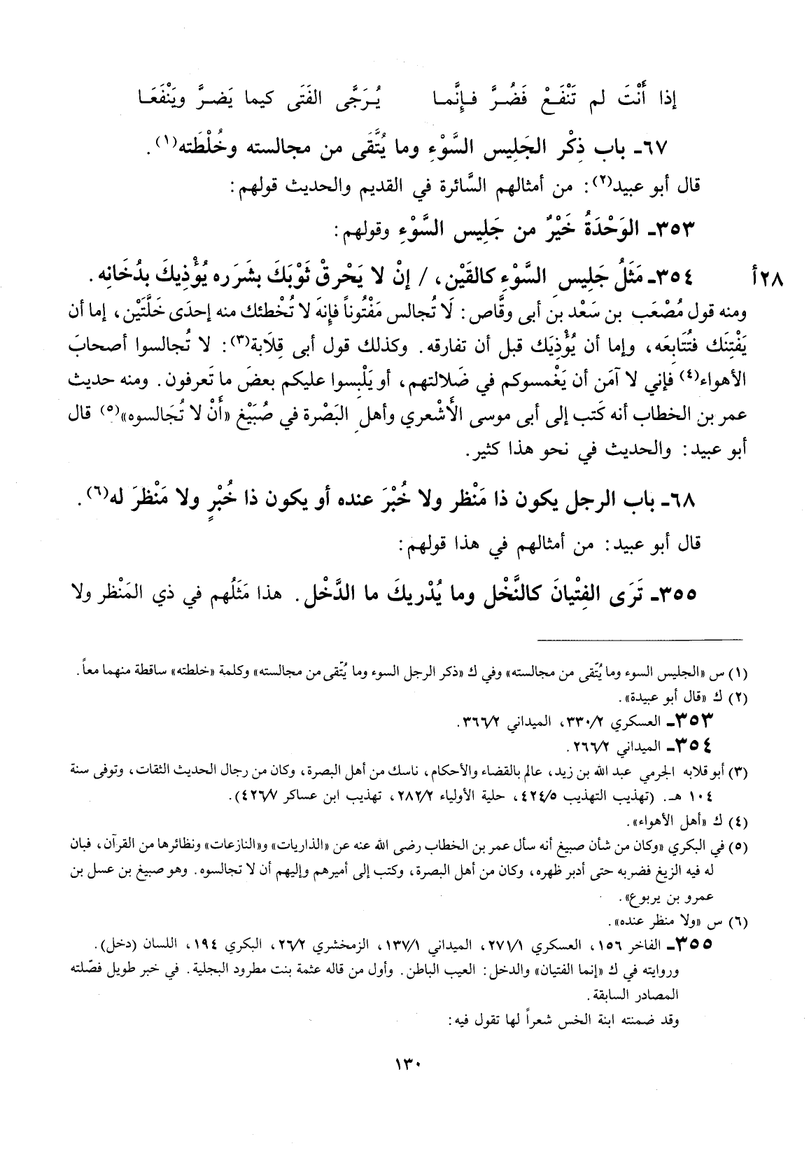 ومنه قول مصعب بن سعد بن أبي وقاص: لا تجالسن مفتونا فانه لا تخطئك منه إحدى خليتين، إما أنَّ يفتنك فتتبعه، وأما أنَّ يؤذيك قبل أنَّ تفارقه. وكذلك قول أبى قلابة: لا تجالسوا أصحاب الأهواء فإني لا أمن أنَّ يغمسوكم في ضلالتهم، أو يلبسوا عليكم بعض ما تعرفون. ومنه حديث عمر بن الخطاب إنّه كتب إلى موسى الأشعري وأهل البصرة في صبيغ " أنَّ لا تجالسوه " قال أبو عبيد: والحديث في نحو هذا كثير.