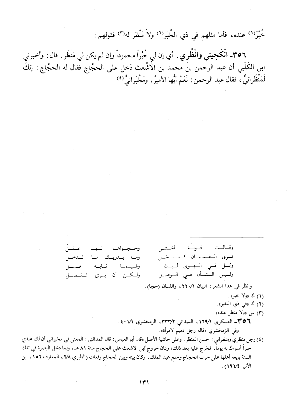 خبر عنده، فأما مثلهم في ذي الخبر ولا منظر له فقولهم: أنكحيني وانظري، أي إنَّ لي خبراً محموداُ وإنَّ لم يكن لي منظر. قال: وأخبرني أبن الكلبي إنَّ عبد الرحمن بن محمّد بن الأشعث دخل على الحجاج فقال له الحجاج: انك لمنظراني، فقال عبد الرحمن: نعم أيّها الأمير، ومخبراني
